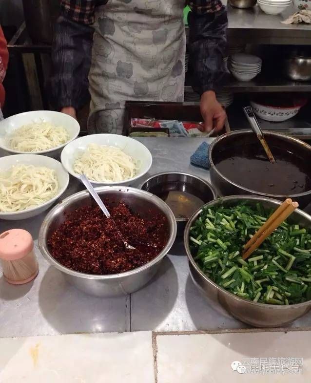 玉溪的老店“洪記”,以涼米線馳名:先在一團(tuán)米線上碼韭菜,再蓋一大片厚豌豆涼粉,依次放入甜子(自制酸醋)、甜醬油、芝麻醬、鹽水,最后淋一勺帶油渣的油辣子。