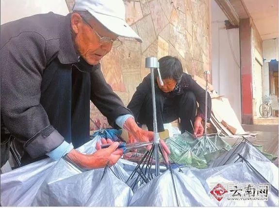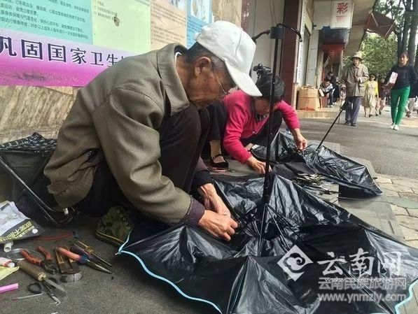 但昆明市新聞路一家銀行外的臺(tái)階上,有一對七旬老夫妻,他們幾乎每天都在這里擺攤修傘,風(fēng)雨無阻十多年如一日。丈夫修傘,老伴在一旁打下手,樸實(shí)、簡陋的攤子,在老人手中,開出一朵朵傘花。