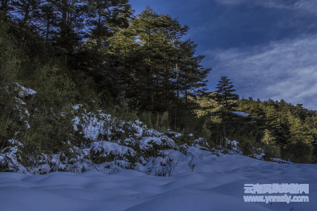 皚皚白雪覆蓋了進(jìn)山的路,劇組工作人員抗著機(jī)器步行一個多小時進(jìn)山,沿途的雪景沒有北方的厚實(shí),看不到一片雪白,伴著湛藍(lán)的天、翠綠的樹、隱約可見的草地,別有一番風(fēng)味。