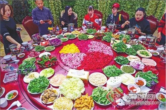 在嵩明花博園,滿桌鮮花食材,艷麗繽紛五彩十色。落座后安靜地欣賞,誰也不愿動第一筷。火鍋是每人一個,五彩十色的花盡管往里投,滿滿一桌鮮花宴400元,人均消費僅40元。
