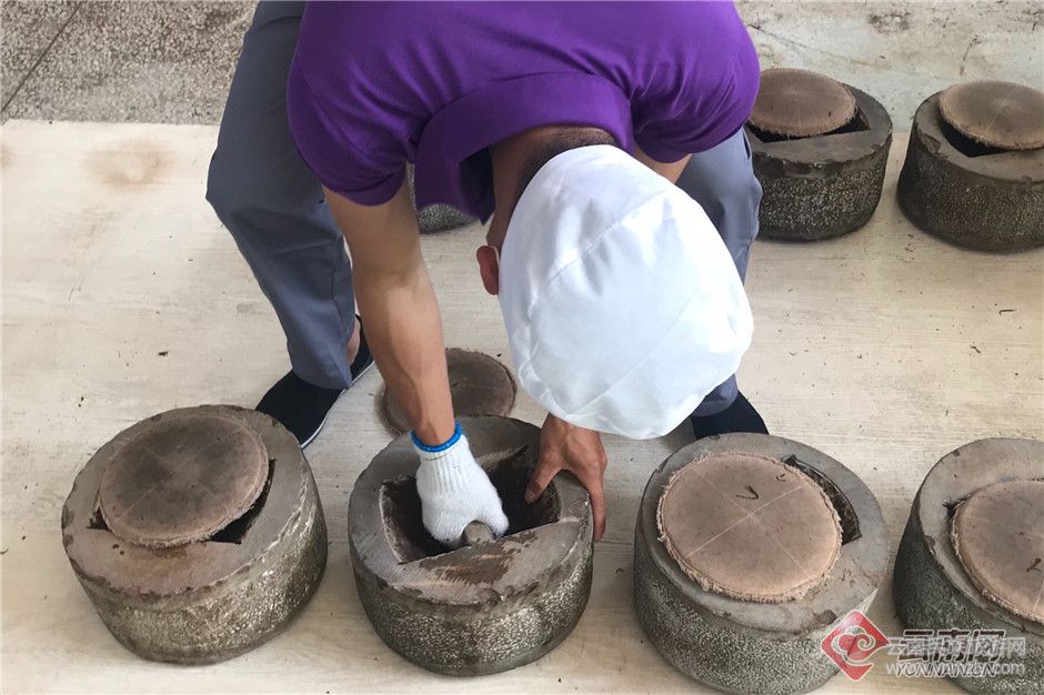 裝袋后把揉好的餅壓在石磨底下固定餅形,一般壓鐵之后,等差不多3-5分鐘就可以把餅?zāi)贸鰜怼MǔU魤汉笥袌F茶、磚茶、餅茶、沱茶,瓜茶等不同形狀的普洱茶緊壓茶。