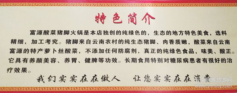 據(jù)老板介紹,“富源酸湯豬腳,食材均選自上好的土豬,精心慢燉后,吃在嘴里,肉酥軟而不爛,更保留了豐富的膠原蛋白。而酸菜的做法更是傳承了地道傳統(tǒng)的腌制方法,酸酸爽爽,營(yíng)養(yǎng)美味的豬腳遇上酸爽的酸菜,奇特的味道刺激著你的味蕾,讓你吃了還想吃,吃了不會(huì)膩。我們的火鍋選料都很講究,做工也是很考究,豬肉都是用農(nóng)村的純生態(tài)肉,酸菜來(lái)自云南富源特產(chǎn)的蘿卜絲酸菜,不添加任何防腐劑,屬于真正的純綠色食品。同時(shí),它還具有養(yǎng)顏美容、養(yǎng)胃、健脾等功效,長(zhǎng)期食用,對(duì)于糖料病患者也有一定的治療效果。”