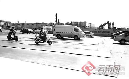 3月16日晚8時許,昆明下了場春雨,劉先生雨后騎摩托車去看孫子,從白塔路右轉(zhuǎn)人民東路時,被路面上的一塊鐵板崴翻摔倒骨折。其實,坑人的路面并不只有這里,比如滇池路與廣福路交叉口路中央就擺著多塊鐵板,騎車路過需要特別小心翼翼,滇池路七檢站附近數(shù)百米路段,每隔10多米就能看到四五厘米深的坑,很容易崴到非機動車。