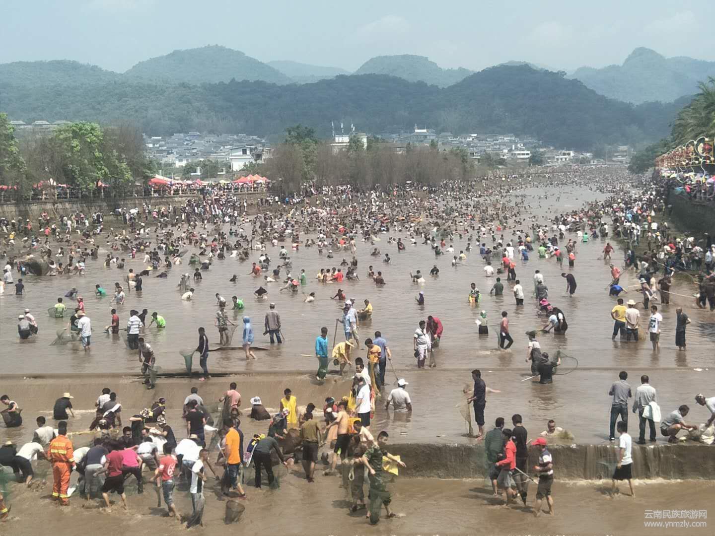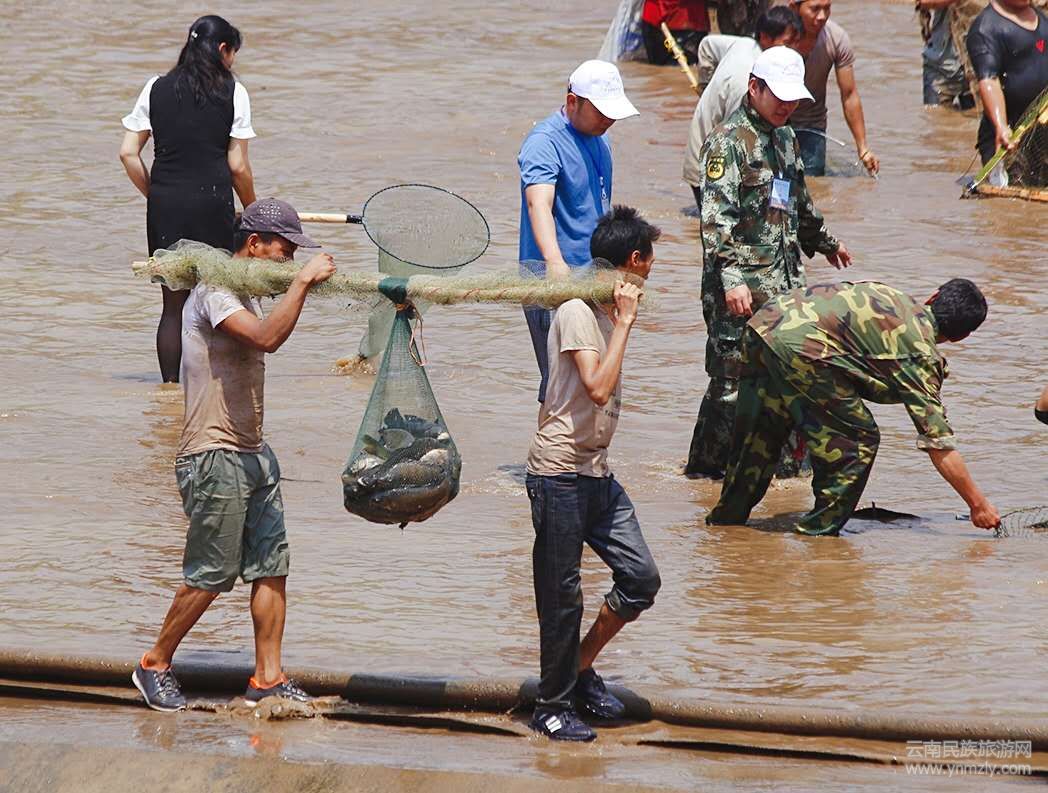 為了捉到大魚,捉神魚的各族群眾及游客都想盡各種辦法,魚兜、魚簍,凡是能捕魚的工具都用上了。河里是各顯身手的捉魚大軍,河岸則有看熱鬧的,拍照片的,攝像的,像趕集似的,人們互不相識(shí),不怕勞累一起盡情體驗(yàn)?zāi)蠅竞訌V闊河面神魚歡騰、萬人同樂的宏大場(chǎng)面,共同分享“活捉” 神魚帶來的刺激。經(jīng)稱重,捉到單體最重魚的前3名的人,分別可獲得神魚王的獎(jiǎng)金。
