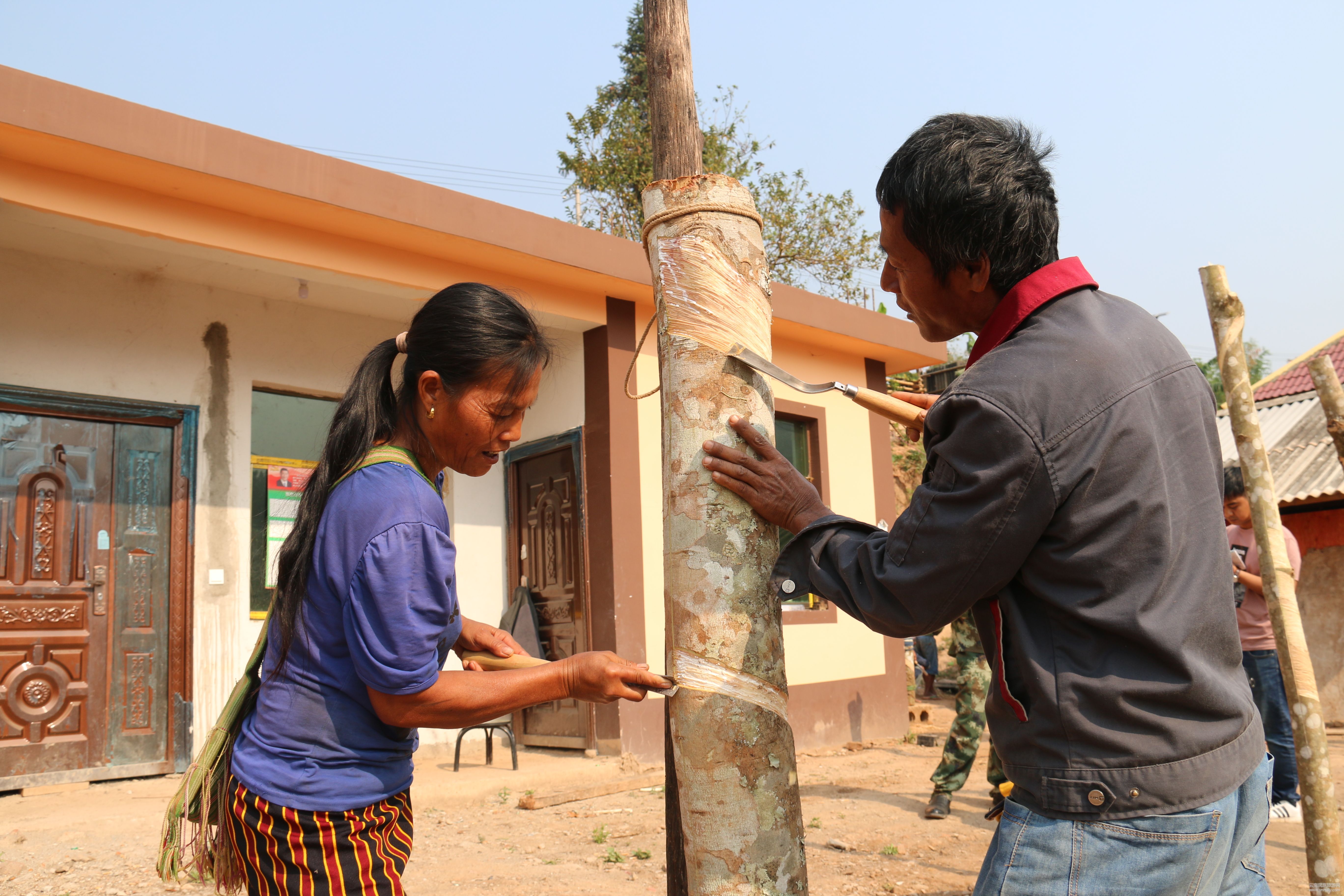 “你的刀法不對(duì),刻得太深了,這樣會(huì)傷到樹(shù)的表皮,出膠量也少。”看一位長(zhǎng)者刀法不對(duì),培訓(xùn)老師周文云接過(guò)膠刀,嫻熟地表演著。在身邊的幾十名群眾中,周文云最得意的是一位傣族婦女艾坡,她是這群“學(xué)員”里學(xué)的最快、刀法最好的一位。