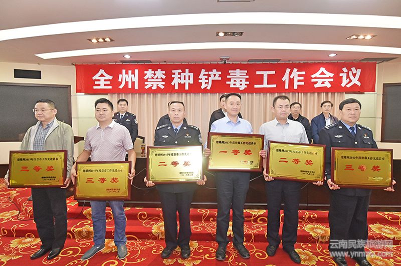 會上,楚雄州政府副秘書長阮建文通報了《楚雄州禁毒委關(guān)于表揚2017年度禁毒工作先進縣市、先進集體的決定》《云南省禁毒委員會關(guān)于授予楚雄市北浦中學(xué)等6所中、小學(xué)校“省級毒品預(yù)防教育示范學(xué)校”稱號的決定》《楚雄州禁毒委關(guān)于授予楚雄市東興中學(xué)等14所中、小學(xué)校“州級毒品預(yù)防教育示范學(xué)校”稱號的決定》,對獲得一、二、三等獎的先進縣(市)政府頒發(fā)獎牌,對2017年省級和州級毒品預(yù)防教育示范學(xué)校代表頒發(fā)獎牌;楚雄州公安局施懷祥副局長通報了2017年全州禁毒工作及禁種鏟毒專項情況;姚安縣、牟定縣、祿豐縣3縣禁毒委主任作開展禁種鏟毒工作發(fā)言;州政府還與10縣市人民政府簽訂《2018年禁毒工作責(zé)任狀》,與州禁毒委成員單位代表簽訂《2018年禁毒工作責(zé)任書》。