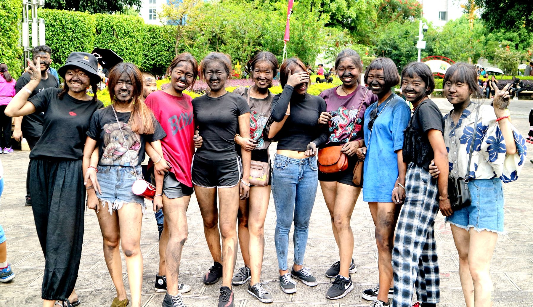 中午12點(diǎn)30分,來(lái)自世界各地的上萬(wàn)名游客在太陽(yáng)廣場(chǎng)參加摸黑臉活動(dòng),廣場(chǎng)四周分別用木桌支起幾口底朝天的大鍋。無(wú)論男女老幼,紛紛向鍋底一摸,便沖向人群加入“抹黑大戰(zhàn)”。人潮中幾乎無(wú)一人幸免,游客整張臉都被抹得只見(jiàn)忽閃的眼睛和咧嘴笑露出的牙齒。就連在現(xiàn)場(chǎng)維持秩序的民警也“難逃一劫”。墨江哈尼族,素有“拜火”的傳統(tǒng),當(dāng)?shù)厝藢⒑诨乙暈?ldquo;火的結(jié)晶”,是吉祥的象征。在喜慶的場(chǎng)合,當(dāng)?shù)厝顺S?ldquo;抹黑你”來(lái)表達(dá)祝福。抹黑滿臉,代表開(kāi)心永久、快樂(lè)永久;抹黑得越多,意味著幸福就越多。這就是墨江人歡迎、祝福來(lái)自遠(yuǎn)方來(lái)客人的一種特殊方式。