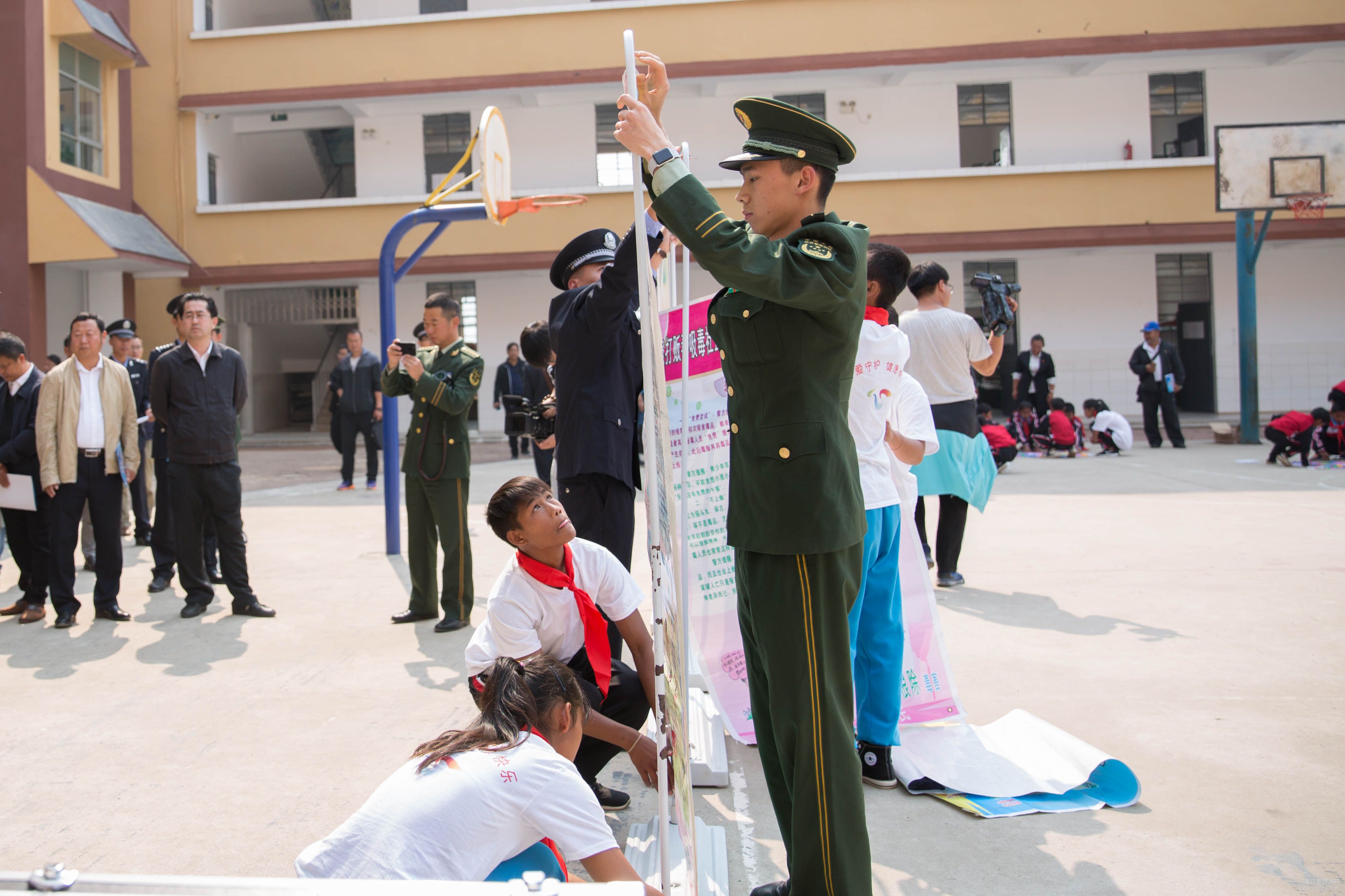 隨著力所公安邊防派出所民警邱云的介紹,一名民警和一名邊防派出所戰(zhàn)士,迅速打開一個箱子,從里面拿出“移動展板”的底座。學(xué)校的孩子們也嫻熟地予以配合,迅速將底座放置好,掛上展板,動作敏捷。轉(zhuǎn)眼間,一個“移動展板”就立在了操場中間。