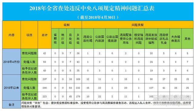 2018年4月,云南省各級(jí)紀(jì)檢監(jiān)察機(jī)關(guān)查處違反中央八項(xiàng)規(guī)定精神問題43起,處理50人,給予黨紀(jì)政務(wù)處分40人。