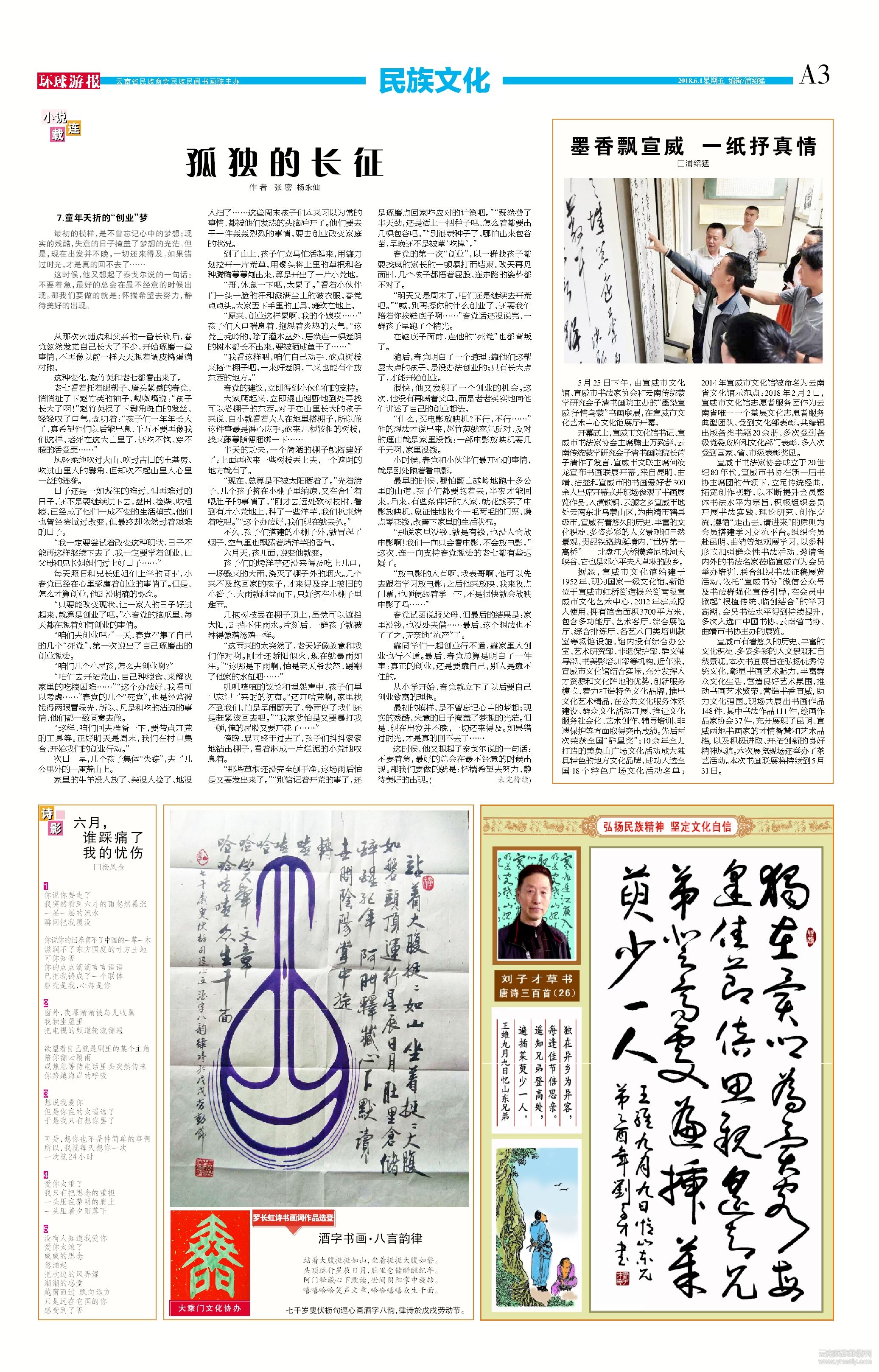 宣威市有著悠久的歷史、豐富的文化積淀、多姿多彩的人文景觀和自然景觀。本次書畫展旨在弘揚優(yōu)秀傳統(tǒng)文化,彰顯書畫藝術魅力,豐富群眾文化生活,營造良好藝術氛圍,推動書畫藝術繁榮,營造書香宣威, 助力文化強國。現(xiàn)場共展出書畫作品148件,其中書法作品111件,繪畫作品家協(xié)會37件,充分展現(xiàn)了昆明、宣威兩地書畫家的才情智慧和藝術品格, 以及積極進取、開拓創(chuàng)新的良好精神風貌。本次展覽現(xiàn)場還舉辦了茶藝活動。本次書畫聯(lián)展將持續(xù)到5月31日。□浦紹猛(文章來源環(huán)球游報2018年6月1日第1142期A3版)