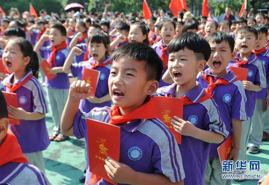 在2017年5月26日安徽省亳州市譙城區(qū)風(fēng)華小學(xué)舉行的入隊(duì)儀式上,孩子們?cè)谛x入隊(duì)誓詞。新華社發(fā)(張延林 攝)