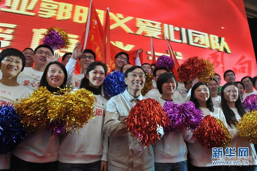 在2012年3月4日舉行的“中央企業(yè)郭明義愛(ài)心團(tuán)隊(duì)”授旗儀式現(xiàn)場(chǎng),郭明義與愛(ài)心團(tuán)隊(duì)合影。新華社發(fā)(胡慶明 攝)