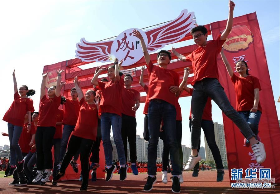 安徽淮南市第二中學(xué)學(xué)生穿越“成人門(mén)”(2018年5月4日攝)。新華社發(fā)(陳彬 攝)