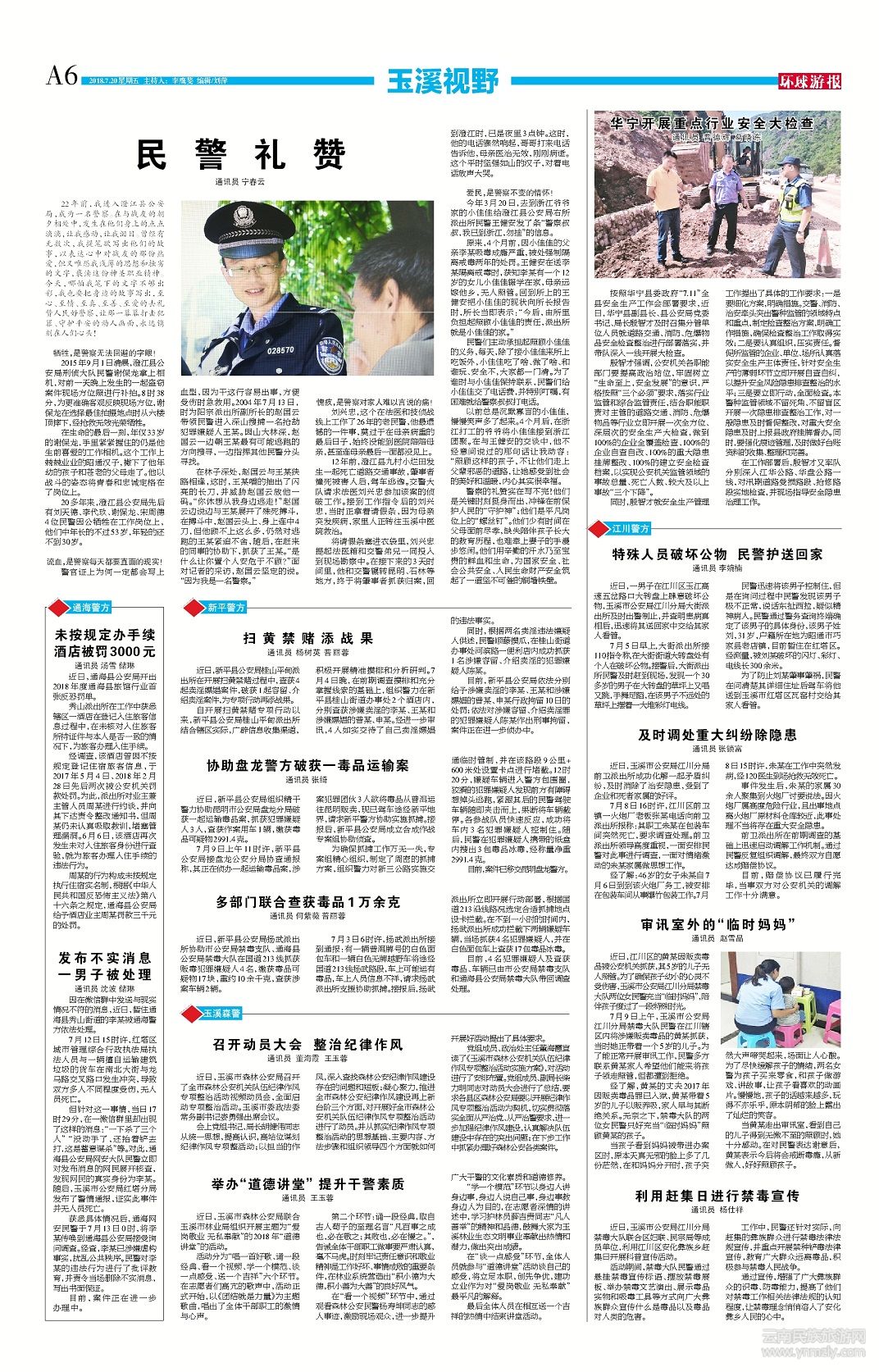 22年前,我進(jìn)入澄江縣公安局,成為一名警察。在與戰(zhàn)友的朝夕相處中,發(fā)生在他們身上的點(diǎn)點(diǎn)滴滴,讓我感動(dòng),讓我淚目。曾經(jīng)有無(wú)數(shù)次,我提筆欲寫(xiě)出他們的故事,以表達(dá)心中對(duì)戰(zhàn)友的那份熱愛(ài),但又唯恐我淺薄的思想和拙劣的文字,褻瀆這份神圣職業(yè)精神。今天,哪怕我筆下的文字不夠出彩,我也要把身邊的故事寫(xiě)出,至心、至情、至真、至善、至愛(ài)的去禮贊人民好警察,讓那一幕幕打擊犯罪、守護(hù)平安的動(dòng)人畫(huà)面,永遠(yuǎn)鐫刻在人們心頭!