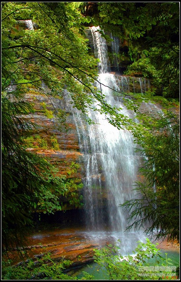 少女瀑 瀑水從長約40米,寬約30米的平臺上垂直跌落,落差20余米,溢寬約2米。瀑水如一根根青絲銀線從天而落,清新、秀麗,彌漫著青春少女浪漫、純真的氣息。四周藤木垂吊,綠草茵茵,云霧飄來,瀑水朦朧,只聞悅耳瀑音,如一位清麗的少女扯霧為紗,懷抱琵琶半遮面,幽靜雅怡,充滿少女之韻。