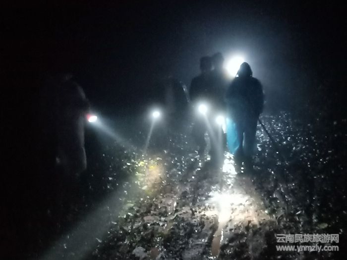 漆黑的環(huán)境伴隨著厚厚的濃霧,給在羊腸鳥道中穿行的搜救民警增加了困難。同時,穿行中,搜救民警還要時時查看著手機有無信號,以便于能夠及時聯(lián)系到姜某某。