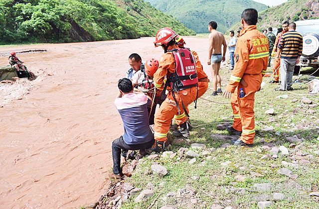 到達(dá)現(xiàn)場(chǎng)時(shí),只見(jiàn)馬龍河水越漲越大,一輛越野車被困河中央,車頂上蹲著三名男子命懸一線,隨時(shí)有被洪水沖走的危險(xiǎn)。救援人員立即找來(lái)皮劃艇,試圖劃到河中間實(shí)施救援,哪知由于河水太急,皮劃艇剛剛?cè)胨捅缓樗疀_翻,無(wú)法駛?cè)搿>仍藛T只好找來(lái)礦泉水瓶拴在繩子一端,用力將繩子扔給被困男子,再想辦法將救生衣、防護(hù)腰帶、頭盔等工具運(yùn)送給被困人員進(jìn)行防護(hù),然后逐一將受困人員救上岸。