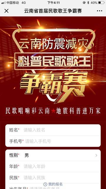 大賽主題是民歌唱響彩云南,地震科普進(jìn)萬家。歌曲需從《防震減災(zāi)重預(yù)防》、《地震來了你莫慌》、《震后自救有講究》、《地震救援講安全》、《科普知識保安康》、《小朋友們要知道》六首歌中選擇一首自由創(chuàng)作后參加比賽,演唱形式不限。選手不限年齡,所有熱愛民歌并且關(guān)注公益事業(yè)的公民均可報名參加,可單獨報名也可以團(tuán)體代表隊參加。