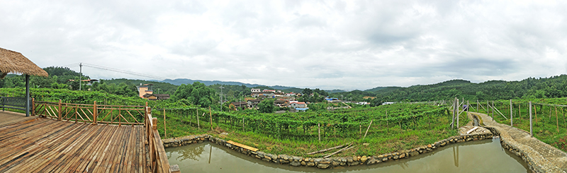 又是一年百香花開,淅淅瀝瀝的盛夏雨水洗刷著芒崗村百香果園里綠得滴油的葉片,順著綠色梯地而上,青磚和鵝暖石鑲嵌而成的棧道和正在園子里勞作的身影,幾位大姐、大媽在果棚下熟練地將七成熟的果子摘下來。順著棧道錯落搭建起的兩個觀景臺,一面可以俯瞰整個果園,一面可以透過稀稀落落的竹林看到不遠處的梯狀田園。每一處都有山有水、有屋有樹、有動有靜,仿佛是一幅幅活動的山水畫。