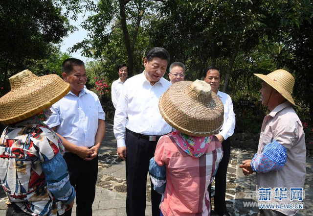 2018年4月11日至13日,習(xí)近平在海南考察。這是4月13日上午,習(xí)近平在海口市秀英區(qū)石山鎮(zhèn)施茶村考察時(shí),同村民親切交談。圖片來源:新華社