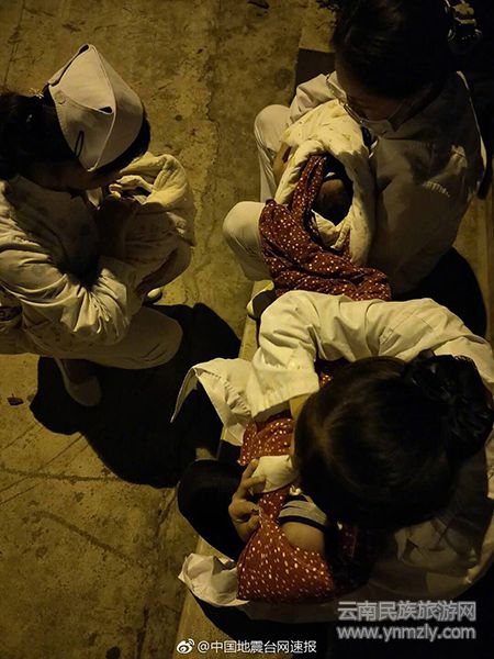 上圖為:通海縣人民醫(yī)院的護(hù)士把新生兒抱到了室外避震。