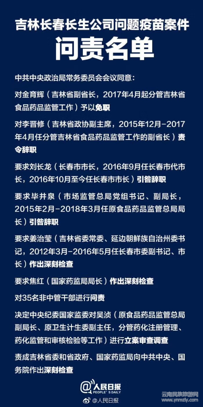 “會(huì)議同意,對(duì)金育輝(吉林省副省長(zhǎng),2017年4月起分管吉林省食品藥品監(jiān)管工作)予以免職,對(duì)李晉修(吉林省政協(xié)副主席,2015年12月-2017年4月任分管吉林省食品藥品監(jiān)管工作的副省長(zhǎng))責(zé)令辭職,要求劉長(zhǎng)龍(長(zhǎng)春市市長(zhǎng),2016年9月任長(zhǎng)春市代市長(zhǎng),2016年10月至今任長(zhǎng)春市市長(zhǎng))、畢井泉(市場(chǎng)監(jiān)管總局黨組書記、副局長(zhǎng),2015年2月-2018年3月任原食品藥品監(jiān)管總局局長(zhǎng))引咎辭職,要求姜治瑩(吉林省委常委、延邊朝鮮族自治州委書記,2012年3月-2016年5月任長(zhǎng)春市委副書記、市長(zhǎng))、焦紅(國(guó)家藥監(jiān)局局長(zhǎng))作出深刻檢查;對(duì)35名非中管干部進(jìn)行問責(zé);決定中央紀(jì)委國(guó)家監(jiān)委對(duì)吳湞(原食品藥品監(jiān)管總局副局長(zhǎng)、原衛(wèi)生計(jì)生委副主任,分管藥化注冊(cè)管理、藥化監(jiān)管和審核檢驗(yàn)等工作)進(jìn)行立案審查調(diào)查。會(huì)議責(zé)成吉林省委和省政府、國(guó)家藥監(jiān)局向中共中央、國(guó)務(wù)院作出深刻檢查。”