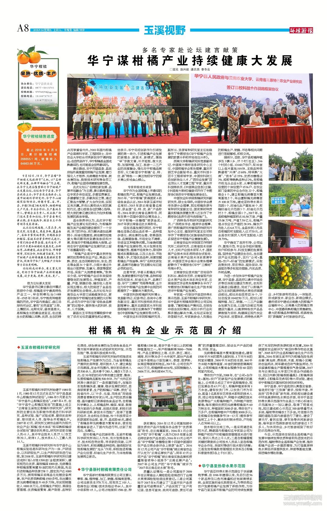 9月10日、11日,華寧縣借“華寧柑橘文化旅游節(jié)”之機,以“名特優(yōu)新發(fā)展,品牌市場融合”為主題,在華寧大酒店隆重舉行華寧柑橘產(chǎn)業(yè)發(fā)展論壇。論壇由華寧縣委、華寧縣政府主辦;華寧縣農(nóng)業(yè)局承辦;玉溪市柑橘科學(xué)研究所、華寧牛山柑橘實驗場協(xié)辦。特邀專家、省、市、縣、鄉(xiāng)鎮(zhèn)(街道)相關(guān)領(lǐng)導(dǎo)、柑橘種植大戶代表、專業(yè)合作社、生產(chǎn)基地負(fù)責(zé)人、營銷企業(yè)負(fù)責(zé)人、農(nóng)業(yè)推廣部門技術(shù)員參加論壇。華寧縣委書記黃云鹍、縣長張燕華、副縣長王平偉等領(lǐng)導(dǎo)發(fā)表講話。