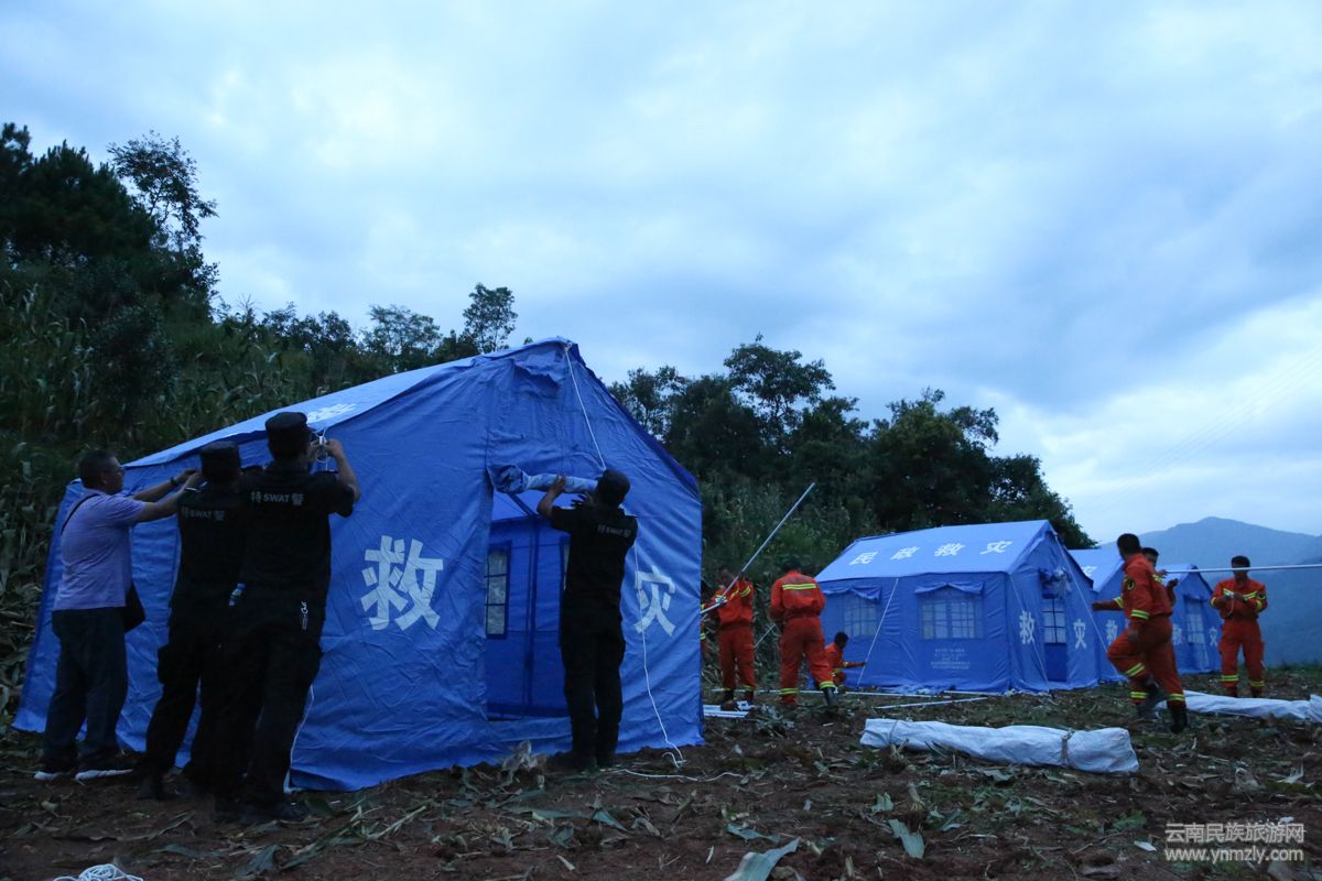 為避免發(fā)生次生災(zāi)害,由墨江縣公安局巡特警大隊、交警大隊和寧洱縣公安局民警組成的救援隊,在完成搜救工作確認(rèn)無被困人員后,及時對危房設(shè)置了警戒。趕在天黑前,在村子附近較為開闊的安全區(qū)域,搭建了40余頂帳篷,讓全村群眾有了棲身之所。