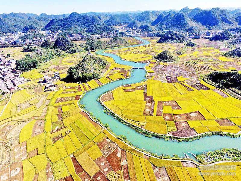 廣南縣八寶鎮(zhèn)外的稻田里,清流潺潺、野茭碧綠、稻田金黃,遠(yuǎn)處青山疊翠、白云悠悠。