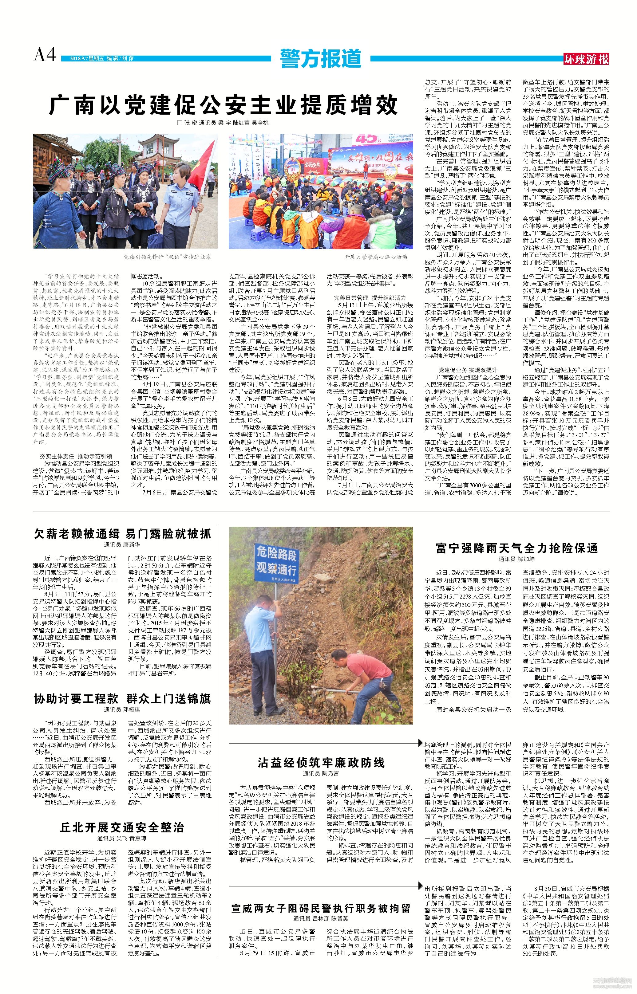 “近年來,廣南縣公安局黨委認真落實黨建工作責任,堅持以‘強黨建、促隊建、謀發(fā)展’為工作思路。以‘學習型、服務(wù)型、創(chuàng)新型’黨組織建設(shè)、‘制度化、規(guī)范化’黨組織標準、打造具有公安特色黨組織亮點的‘三型兩化一打造’為抓手,強力推進各黨支部和全局黨員民警新思想、新組織、新作風和反腐倡廉建設(shè),充分發(fā)揮了黨組織的戰(zhàn)斗堡壘作用和黨員民警的先鋒模范作用。”廣南縣公安局黨委書記、局長譚俊介紹。