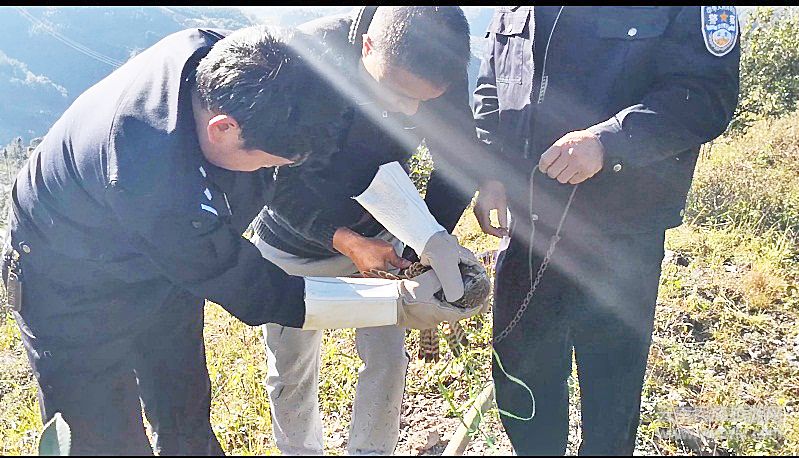 接警后,金平縣森林公安局民警迅速趕到現(xiàn)場,到達現(xiàn)場后發(fā)現(xiàn)這只老鷹模樣的動物被困位置較為特殊,被牢牢困在一根竹竿頂端上,竹竿頂部被人拴著一個捕鼠器,傍靠在一根簡易電線桿旁。民警猜測,這可能是不法分子觀察到有野生鳥類停留駐足在電線桿頂,故動了歪腦筋設下這個陷阱進行捕獵。民警小心翼翼合力將這只野生動物解救下來,并將該陷阱進行了拆除。經(jīng)過仔細觀察,民警發(fā)現(xiàn)這只野生動物左腳上被捕鼠器夾住受傷流血不止,并且已有數(shù)小時。民警隨即將其帶至縣城獸醫(yī)站進行包扎救治。