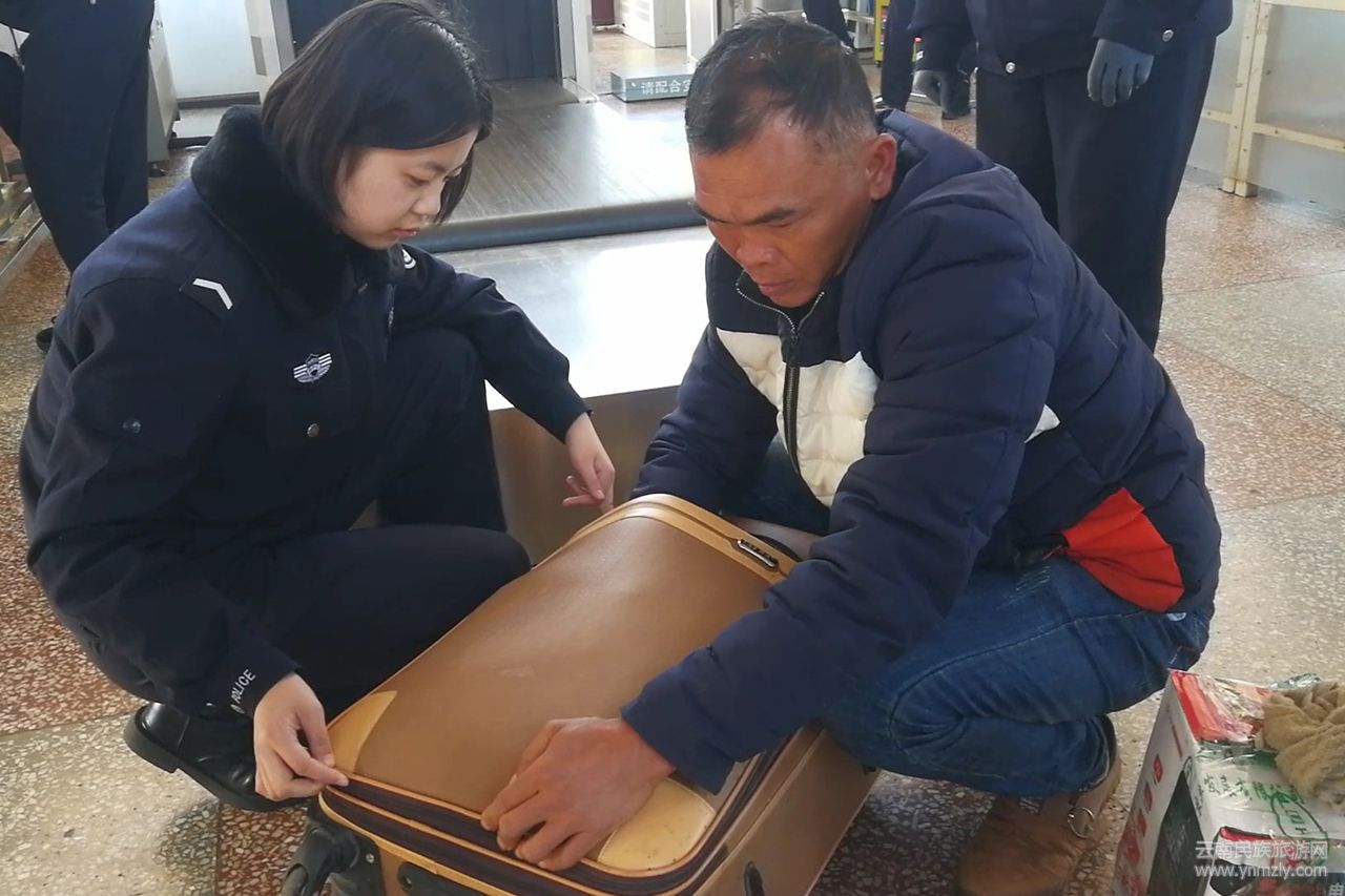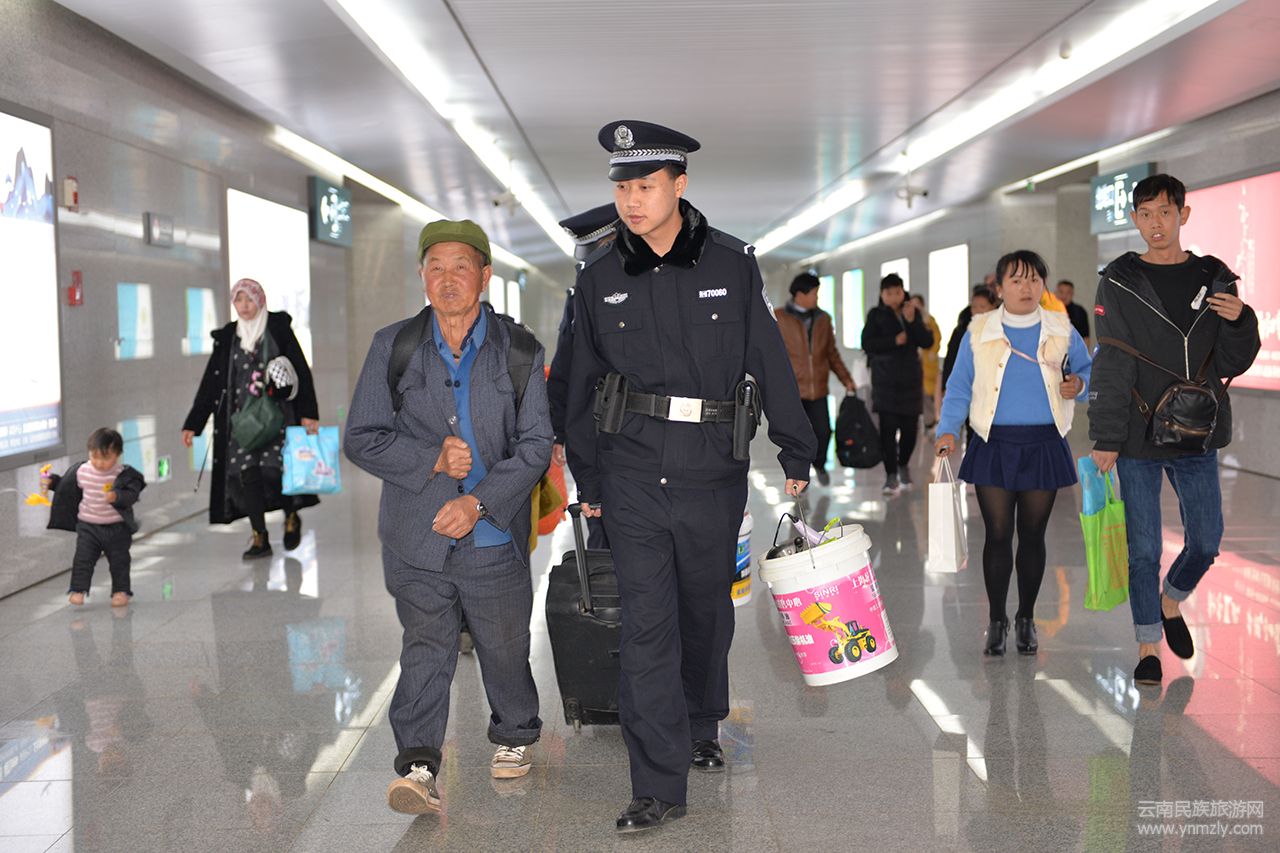 ▲年輕學(xué)警熱心幫助行動(dòng)不便旅客提拿行李
