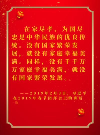 在家盡孝、為國(guó)盡忠是中華民族的優(yōu)良傳統(tǒng)。沒(méi)有國(guó)家繁榮發(fā)展,就沒(méi)有家庭幸福美滿。同樣,沒(méi)有千千萬(wàn)萬(wàn)家庭幸福美滿,就沒(méi)有國(guó)家繁榮發(fā)展。