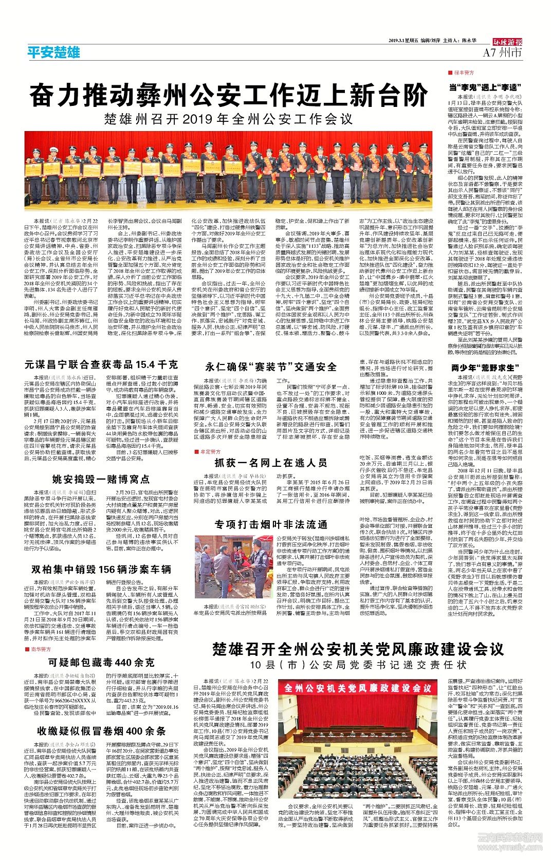 會議要求,2019年全州公安工作要以習(xí)近平新時代中國特色社會主義思想為指導(dǎo),全面貫徹黨的十九大、十九屆二中、三中全會精神,樹牢“四個意識”,堅定“四個自信”,堅決做到“兩個維護”,全面貫徹總體國家安全觀和以人民為中心的發(fā)展思想,堅持穩(wěn)中求進工作總基調(diào),以“鑄忠誠、防風(fēng)險、打硬仗、強本領(lǐng)、增活力、聚警心、鼓斗志”為工作主線,以“政治生態(tài)建設(shè)鞏固提升年、意識形態(tài)工作鞏固提升年、作風(fēng)建設(shè)持續(xù)攻堅年、基層黨建創(chuàng)新提質(zhì)年、公安改革創(chuàng)新年”為總方向,加快推進社會治安治理體系現(xiàn)代化和治理能力現(xiàn)代化,加快推進全面深化公安改革,加快推進隊伍“四化建設(shè)”,奮力推動新時代彝州公安工作邁上新臺階,讓“中國彝鄉(xiāng)·滇中翡翠·紅火楚雄”更加熠熠生輝,以優(yōu)異的成績迎接新中國成立70華誕。