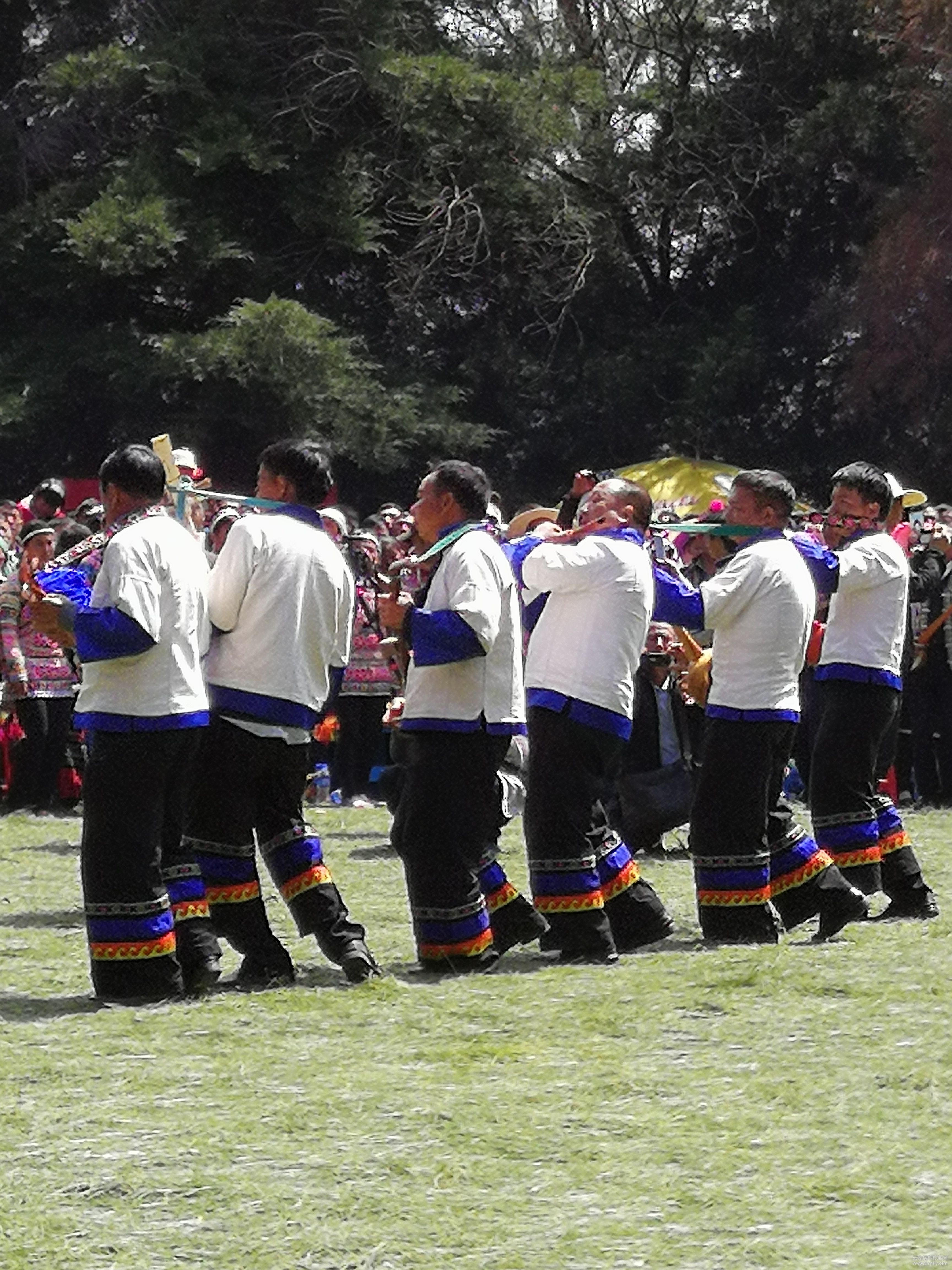 彝家無論男女老少都會唱打歌調。一種是傳統(tǒng)的打歌調,就是流傳在彝族人民中間的傳統(tǒng)史詩。打歌調一般分上支、下支。上支為比喻,下支為敘事。打歌還有一定的規(guī)矩,開始時,由村寨里有聲望的老人開場吹響蘆笙,人們圍著打歌場呼應:“嗚哇——喂!”呼應三次后,才在蘆笙、笛子的指揮下,從原地起步,緩緩進入歌場,開始進場的是老人,當打歌熱鬧起來的時候,老人們退場,青年們大顯身手,圓心越來越大,邊唱邊跳。如是節(jié)日期間的打歌,往往是歌舞不止,通宵達旦。打歌已成為彝族人民的傳統(tǒng)歌舞,“彝家戶戶有火塘,彝家處處是歌場”。在彝區(qū)每一個彝家山寨都有打歌場,無論是山頂埡口、田間平地、農(nóng)家場院、廟宇殿堂都可作為歌場。彝族人民逢年過節(jié),婚喪嫁娶,農(nóng)事閑暇,朝山廟會都要打歌。音樂彝族的民間音樂較有特色的是傳統(tǒng)的嗩吶,俗稱“鼓吹”、“碗口”和“喇叭”。分大筒、大號、小號三種。在歡樂喜慶場所,嗩吶聲熱情奔放,高亢激昂,增添熱鬧氣氛,使人精神振作;在悲哀痛苦場合,嗩吶聲婉轉深沉,嗚咽悲憫,造成哀傷而肅穆的氣氛。