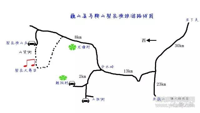 從下關(guān)出發(fā),沿關(guān)巍公路至大倉鎮(zhèn)過境段,紫金馬鞍山路口(即馬鞍山梨花源路口)向西行駛13公里即達(dá)到分水嶺,此處有明顯的交通標(biāo)示牌。