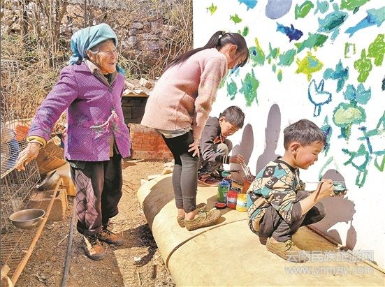 2017年2月,孫海平從昆明學(xué)院到關(guān)中村駐村后,就思考著如何把扶貧工作和自己的藝術(shù)專業(yè)結(jié)合起來。他發(fā)現(xiàn)村里新建的房子都是白墻,想把白墻利用起來。“我從事繪畫專業(yè),來到村里后,被這里美麗的自然環(huán)境所吸引,眼里看到的全是綠水青山,非常適合作畫。”于是,2017年底,孫海平邀請馬來西亞藝術(shù)大師賴偉權(quán)到關(guān)中村走訪,在石門小組村民舒順林家墻壁上畫出了第一幅壁畫——《走向新生活》。