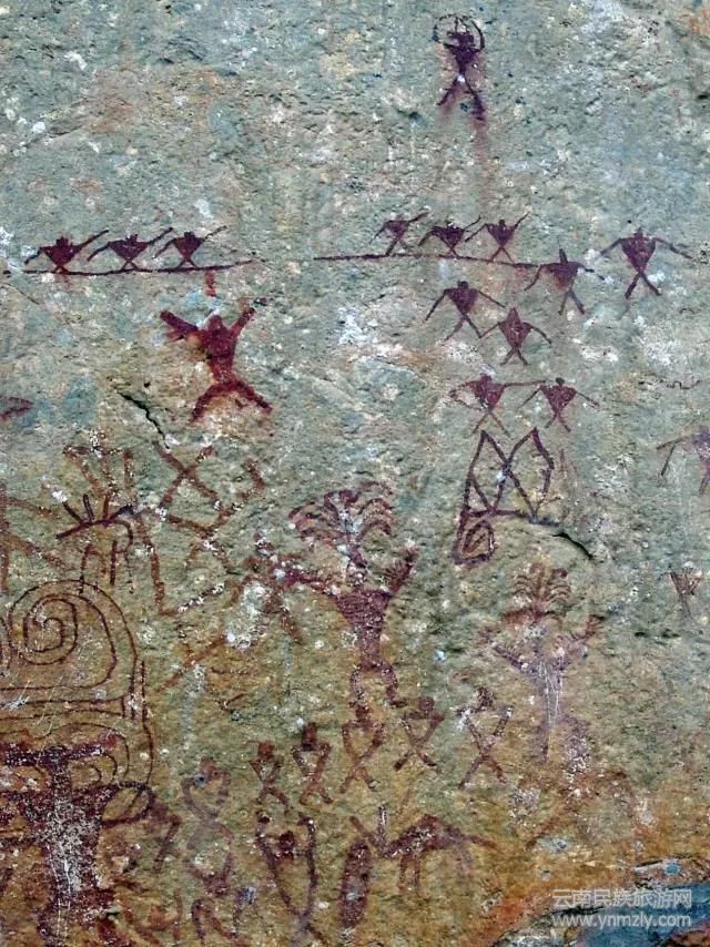 滄源崖畫(huà)是距今三千多年歷史的新石器時(shí)期的文化遺物。最早廣為外界知道和發(fā)現(xiàn)是在1965年 。是佤族先民用手指或羽毛等蘸抹紅色顏料繪成。顏料可能是用動(dòng)物血調(diào)和赤鐵礦粉制作的。崖畫(huà)主要是狩獵、采集等生產(chǎn)活動(dòng)及娛神等宗教活動(dòng)的場(chǎng)面。還有戰(zhàn)爭(zhēng)凱旋圖,上繪干欄式房屋建筑及手持兵器、驅(qū)趕豬羊勝利而歸的人們。所畫(huà)粗獷古樸,是研究南方古代民族歷史的重要資料。