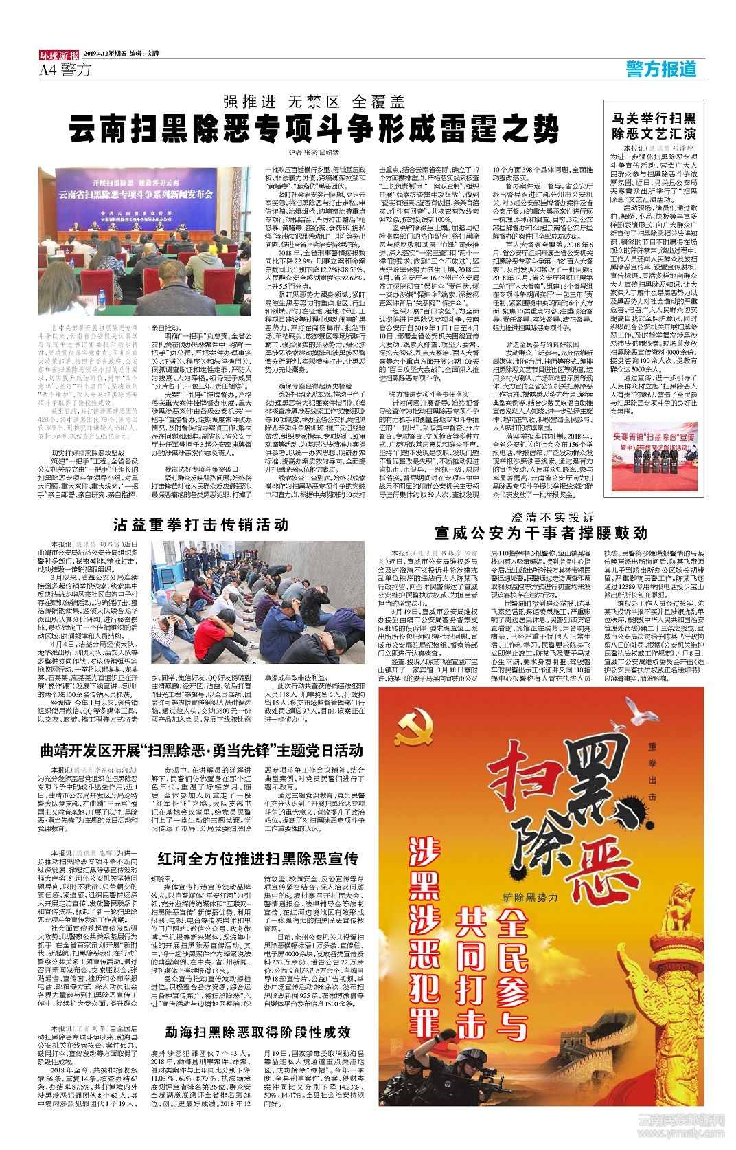 媒體宣傳打造宣傳發(fā)動(dòng)品牌效應(yīng)。以自警媒體“平安紅河”為引領(lǐng),充分發(fā)揮傳統(tǒng)媒體和“互聯(lián)網(wǎng)+掃黑除惡宣傳”新傳播優(yōu)勢(shì),利用報(bào)刊、電視、電臺(tái)等傳統(tǒng)媒體和單位門戶網(wǎng)站、微信公眾號(hào)、政務(wù)微博、手機(jī)報(bào)等新興媒體,系統(tǒng)集中性的開展掃黑除惡宣傳活動(dòng)。其中,將一起涉黑案件作為釋案說(shuō)法的典型案例,在中央、省、州新聞、報(bào)刊媒體上連續(xù)報(bào)道13次。