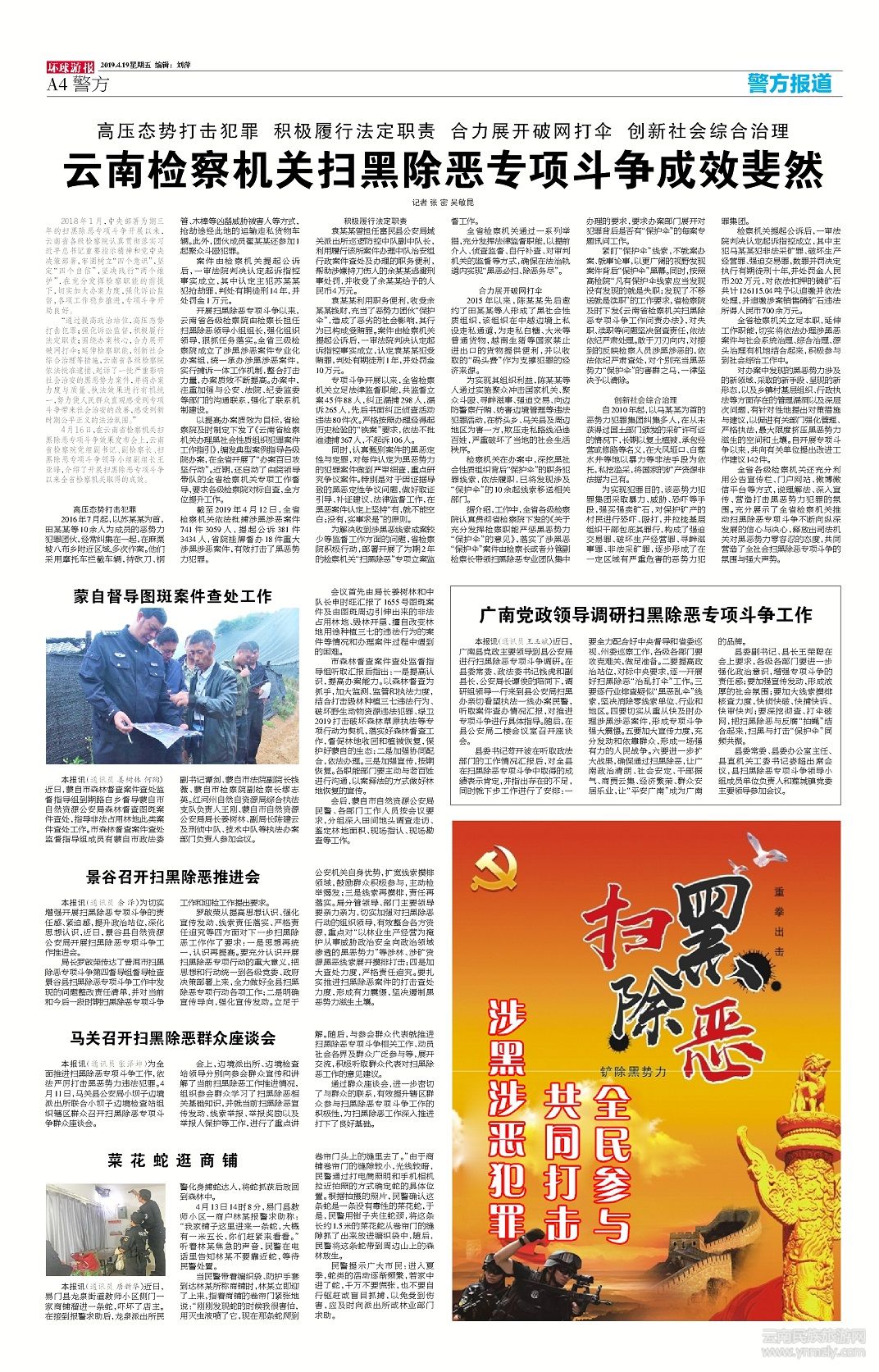 “通過(guò)提高政治站位,高壓態(tài)勢(shì)打擊犯罪;強(qiáng)化訴訟監(jiān)督,積極履行法定職責(zé);圍繞辦案核心,合力展開(kāi)破網(wǎng)打傘;延伸檢察職能,創(chuàng)新社會(huì)綜合治理等措施,云南省各級(jí)檢察院依法批準(zhǔn)逮捕、起訴了一批嚴(yán)重影響社會(huì)治安的黑惡勢(shì)力案件,并將辦案力度與質(zhì)量、執(zhí)法效果進(jìn)行有機(jī)統(tǒng)一,努力使人民群眾直觀感受到專(zhuān)項(xiàng)斗爭(zhēng)帶來(lái)社會(huì)治安的改善,感受到新時(shí)期公平正義的法治氛圍。”