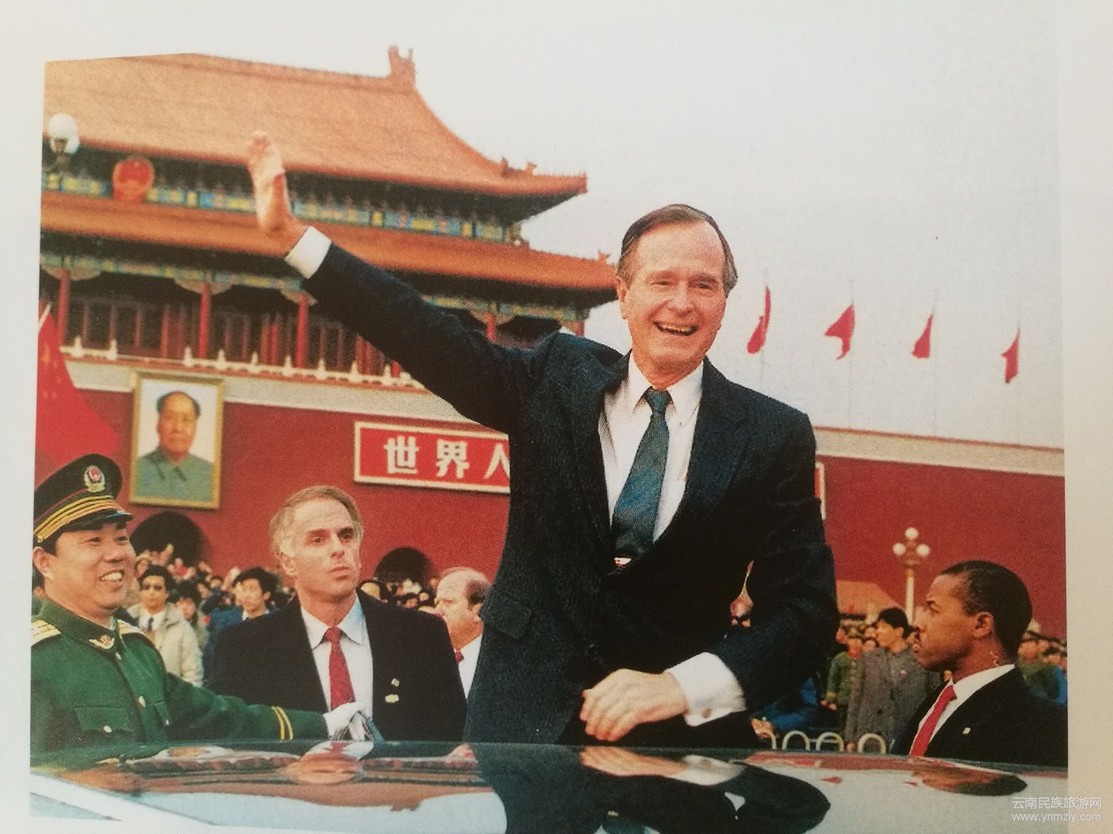 ▲1989年美國(guó)總統(tǒng)布什身穿紅都服裝訪華(資料圖片)