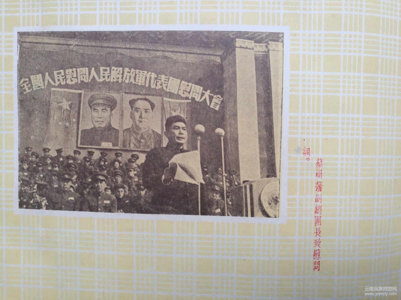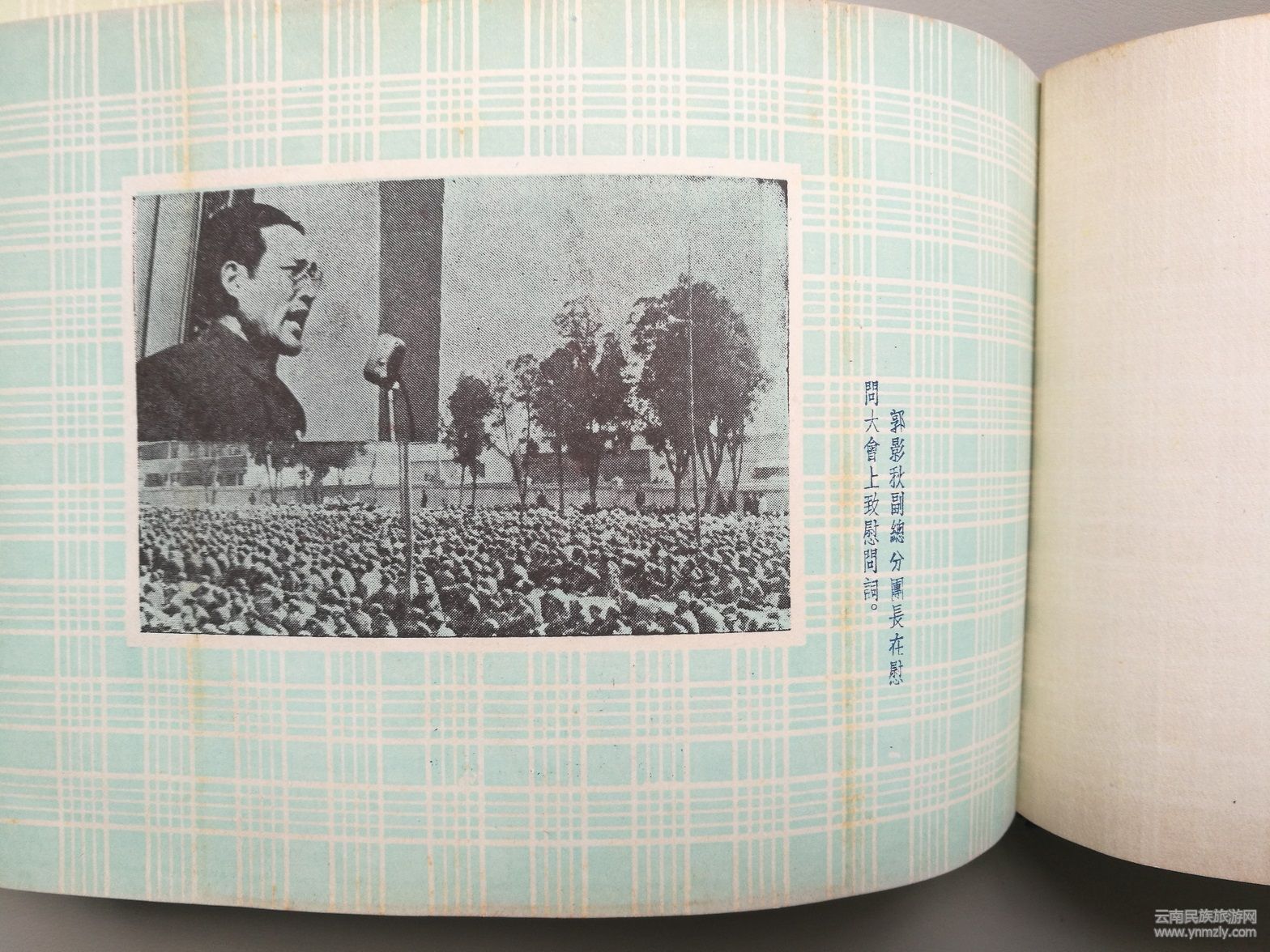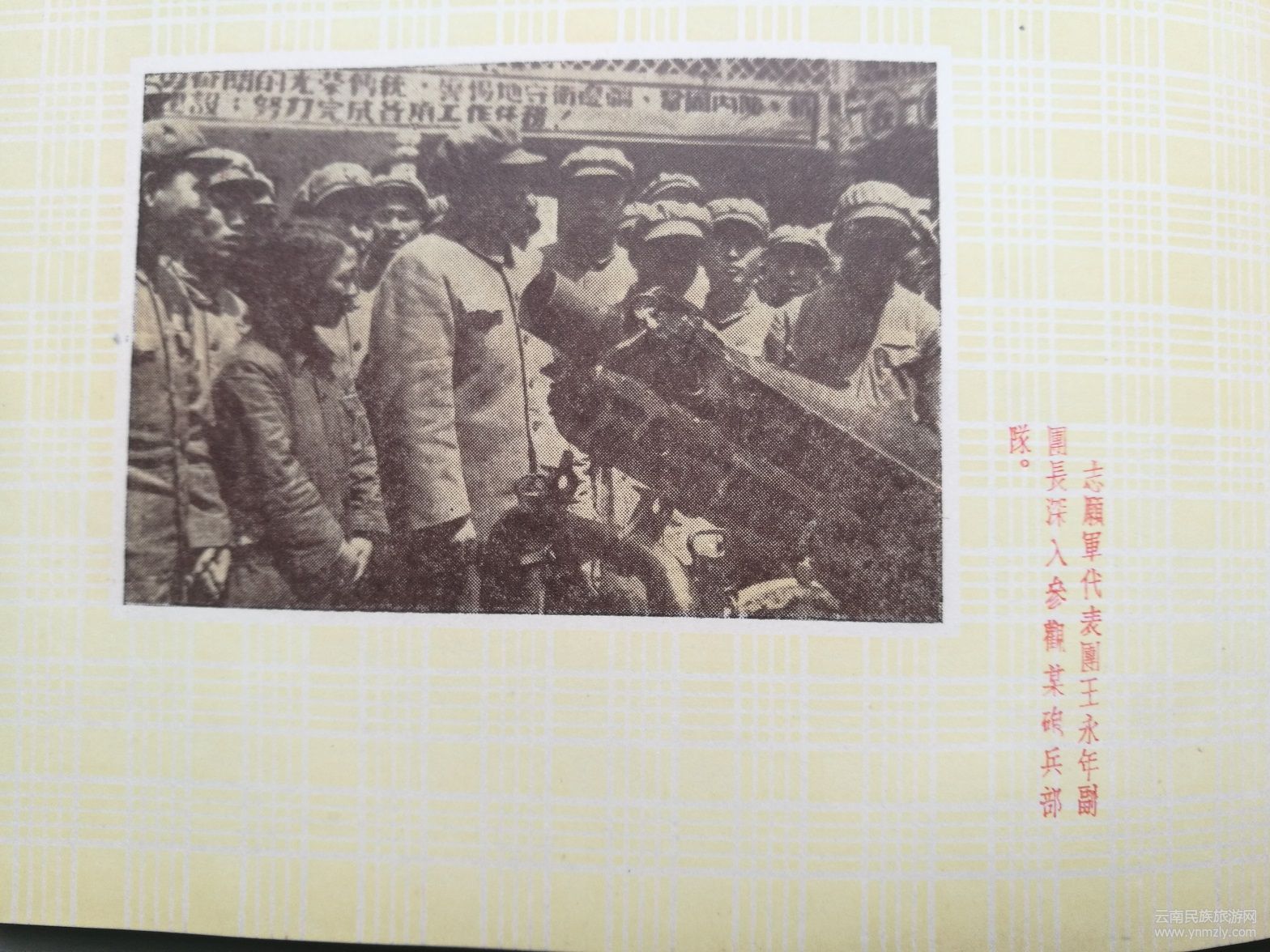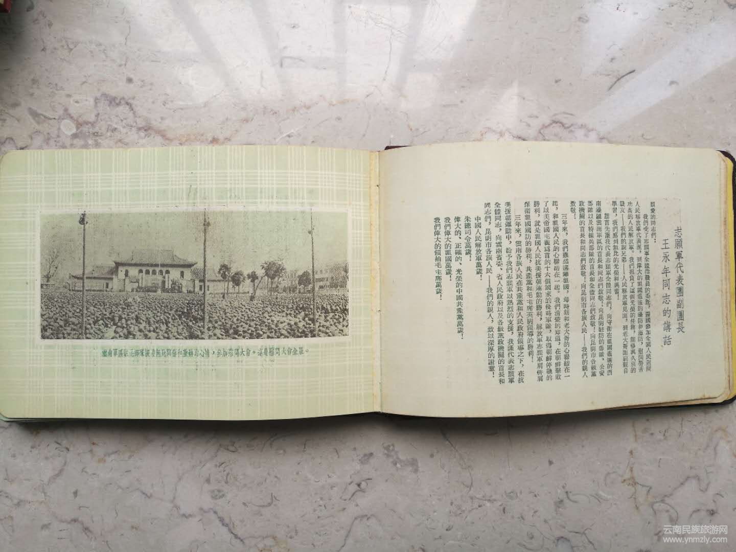 紀(jì)念冊(cè)還收集有云南軍區(qū)秦基偉副司令員在歡迎儀式上的致詞。他致詞表示,你們(代表團(tuán)全體同志)不遠(yuǎn)千里不辭勞苦的來(lái)到祖國(guó)西南邊疆,向云南軍區(qū)部隊(duì)進(jìn)行慰問(wèn),你們不僅帶來(lái)了中國(guó)共產(chǎn)黨中央、中央人民政府、毛主席和全國(guó)人民對(duì)我們的親切關(guān)懷,也帶來(lái)了毛主席關(guān)于黨在過(guò)渡時(shí)期的總路線的指示,帶來(lái)了4年來(lái)祖國(guó)經(jīng)濟(jì)建設(shè)的偉大成就。帶來(lái)了我們親密的戰(zhàn)友一一光榮的中國(guó)人民志愿軍在反侵略戰(zhàn)爭(zhēng)中的偉大勝利和寶貴經(jīng)驗(yàn)。云南軍區(qū)部隊(duì)4年來(lái)和全國(guó)各兄弟軍區(qū)部隊(duì)一樣,由于正確地執(zhí)行了中國(guó)共產(chǎn)黨和毛主席的指示,由于得到了人民的熱愛(ài)和支持,使我們?cè)诒Pl(wèi)邊疆鞏固內(nèi)防的斗爭(zhēng)中有力的打擊了帝國(guó)主義和殘匪對(duì)我邊境的寢擾,把守住了祖國(guó)西南的大門。