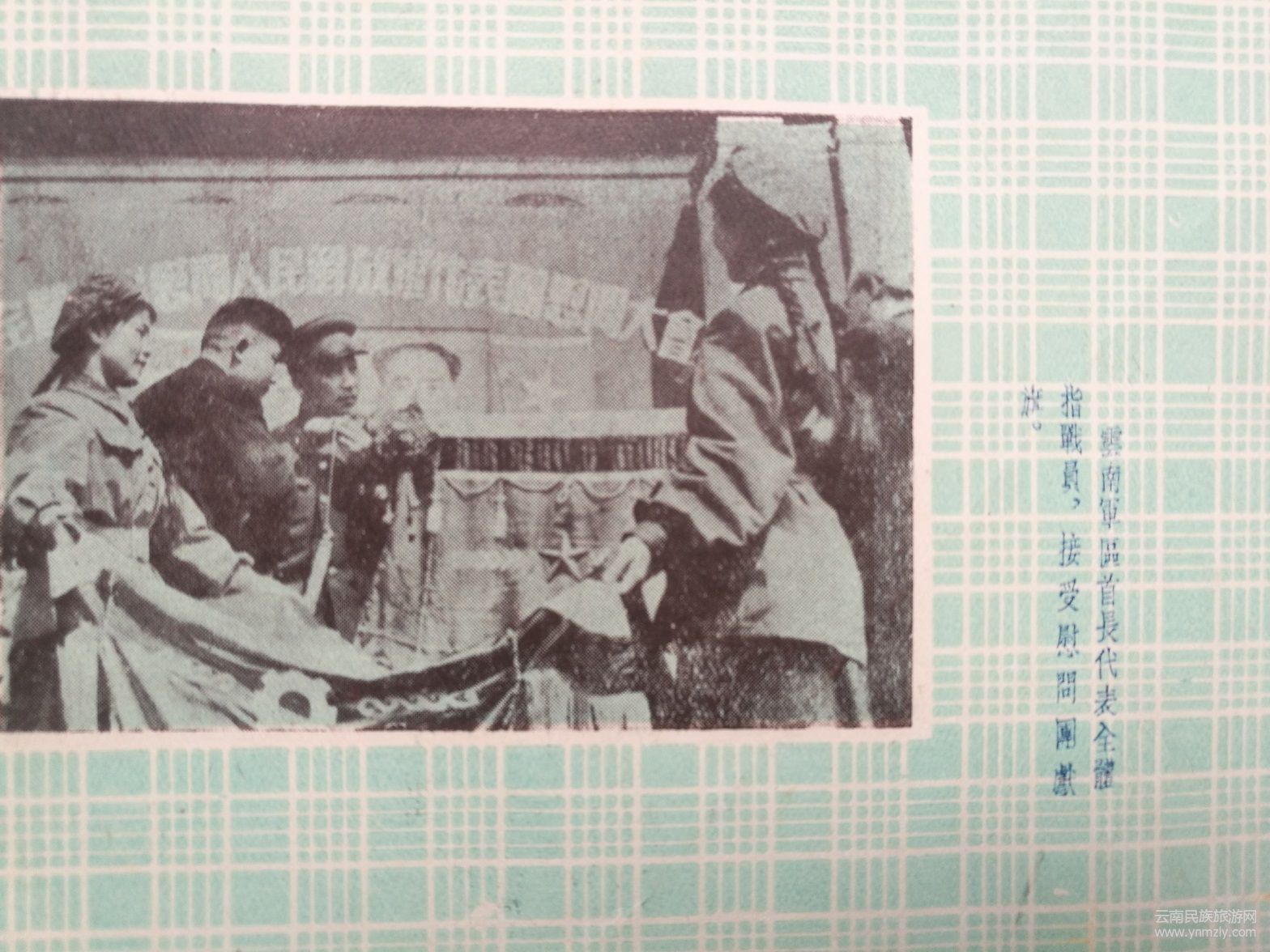 我收藏的這本《紀(jì)念冊(cè)》,是云南軍區(qū)為全國(guó)人民慰問(wèn)人民解放軍代表團(tuán)西南總分團(tuán)的慰問(wèn)活動(dòng)制作的紀(jì)念冊(cè)。紫絨布面,彩色卡紙,印刷精美。冊(cè)內(nèi)收集了幾十幅全國(guó)人民慰問(wèn)解放軍代表團(tuán)在云南的慰問(wèn)活動(dòng)的工作照片,是云南歷史文化的珍貴史料。圖片包括云南軍區(qū)政委謝富治赴昆明站歡迎代表團(tuán)代表同志;