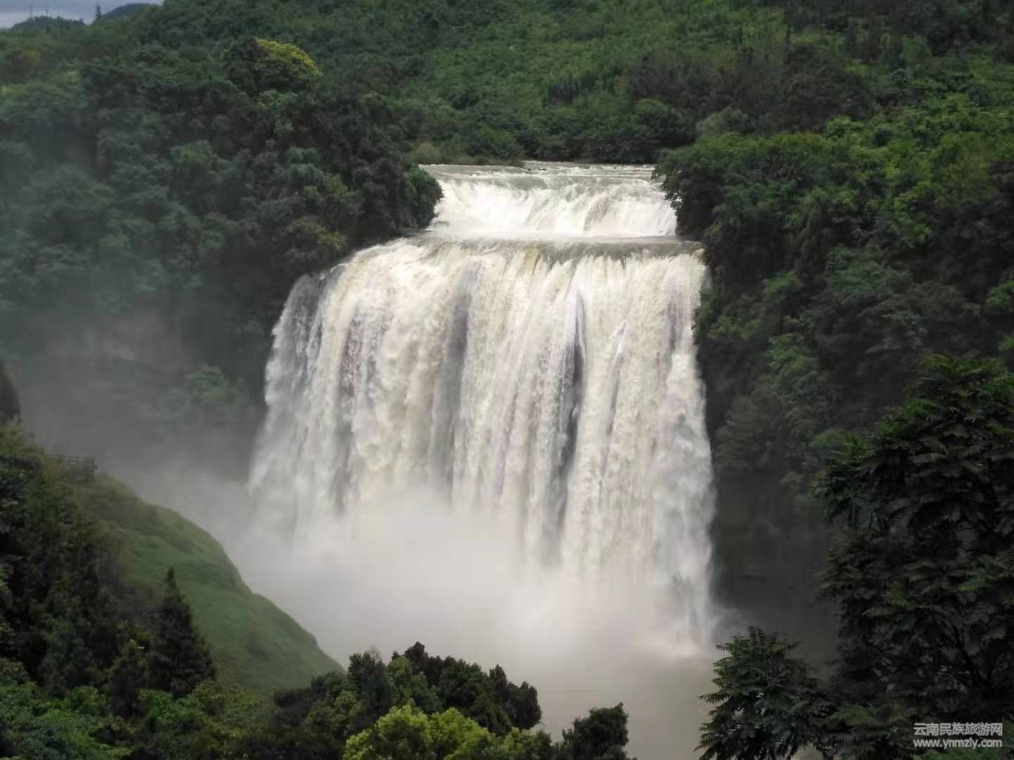 稍前近觀,瀑布如黃河倒傾,峭壁震顫,谷底轟雷,十里外也能聽到咆哮聲。由于水流的強(qiáng)大沖擊力,濺起的水霧可彌漫數(shù)百米以外,使坐落在瀑布左側(cè)崖頂上的寨子和街市,也常被濺起的水霧所籠罩。