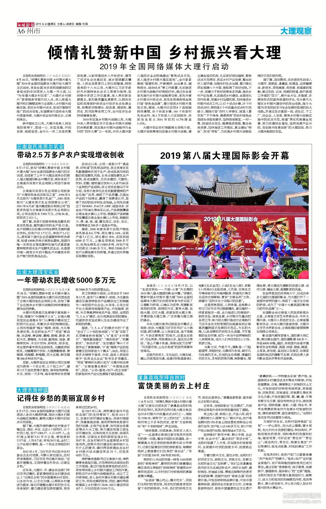 本報訊(記者 趙建云)8月17日,以“生活在別處——萬相·眾享”為主題的2019第八屆大理國際影會開幕。“傾情禮贊新中國鄉(xiāng)村振興看大理”2019全國網(wǎng)絡(luò)媒體大理行采訪團(tuán)有幸參與并紀(jì)錄了以攝影為橋梁、以鏡頭為紐帶,用攝影家獨有的視角、獨特的方式,聚焦大理、定格大理、記憶大理,深度發(fā)現(xiàn)大理之美、盡情創(chuàng)造大理之美、廣泛傳播大理之美的盛會。