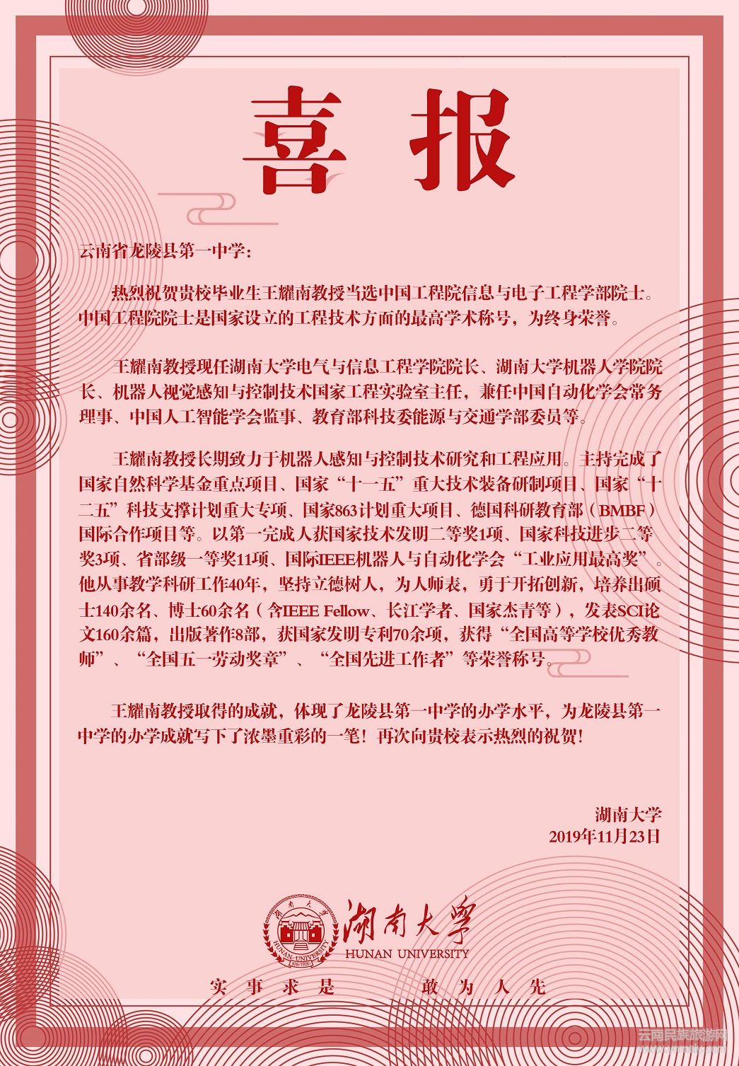 云南民族旅游網(wǎng)訊(崔敏)日前,龍陵縣第一中學(xué)收到了來(lái)自湖南大學(xué)的一封喜報(bào)賀信,對(duì)畢業(yè)于該校、現(xiàn)任湖南大學(xué)電氣與信息工程學(xué)院院長(zhǎng)、湖南大學(xué)機(jī)器人學(xué)院院長(zhǎng)的王耀南教授,當(dāng)選為中國(guó)工程院信息與電子工程學(xué)部院士表示熱烈的祝賀。