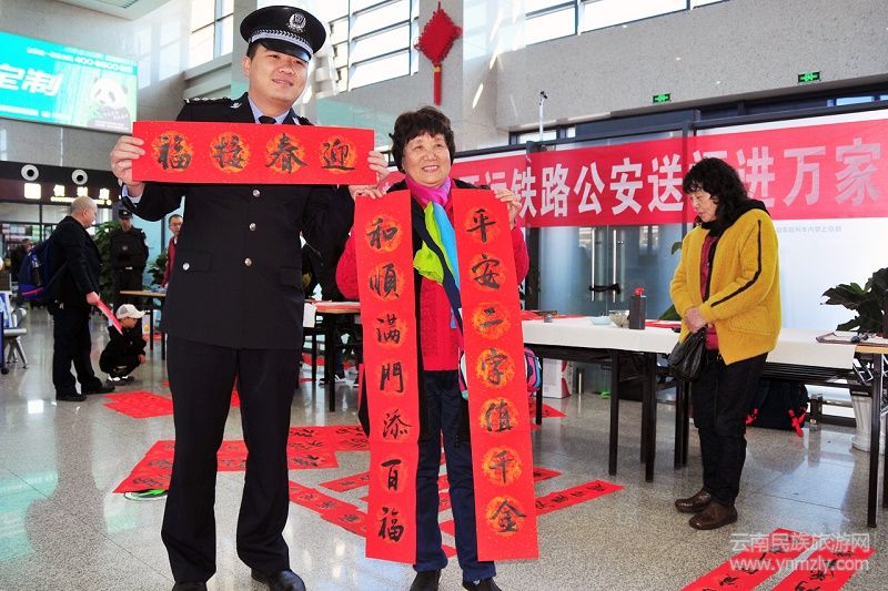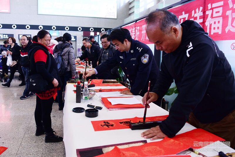 1月10日,昆明鐵路公安局開(kāi)遠(yuǎn)公安處在轄區(qū)內(nèi)彌勒高鐵站開(kāi)展紅火喜慶的“祖國(guó)新春好 送福進(jìn)萬(wàn)家”活動(dòng),鐵路民警們與受邀的開(kāi)遠(yuǎn)和彌勒兩市文聯(lián)協(xié)會(huì)的4位書法家現(xiàn)場(chǎng)揮毫潑墨,為歸途旅客送上新春祝福。
