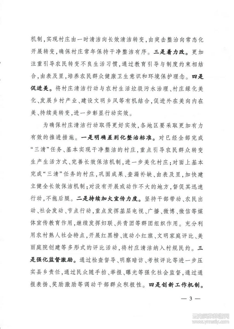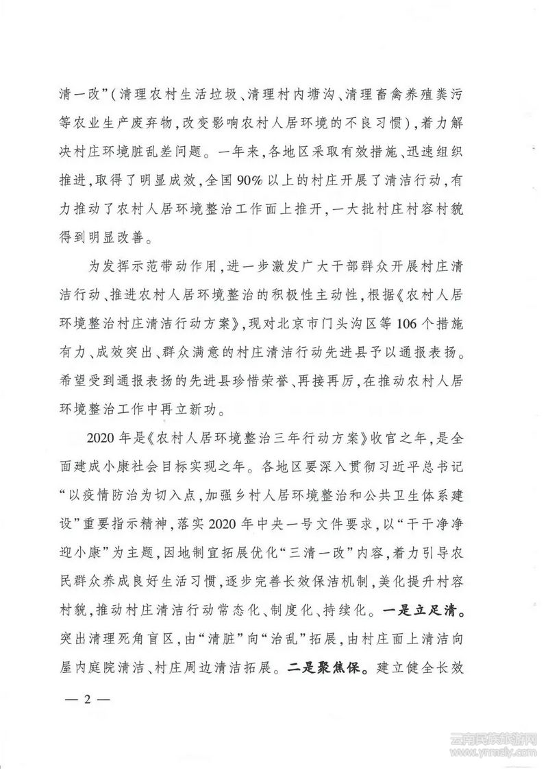 為發(fā)揮示范帶動作用,進一步激發(fā)廣大干部群眾開展村莊清潔行動、推進農(nóng)村人居環(huán)境整治的積極性主動性,中央農(nóng)辦、農(nóng)業(yè)農(nóng)村部日前印發(fā)《關于通報表揚2019年全國村莊清潔行動先進縣 深入開展2020年村莊清潔行動的通知》,對北京市門頭溝區(qū)等106個措施有力、成效突出、群眾滿意的全國村莊清潔行動先進縣予以通報表揚,并對下一步工作作出部署安排。《通知》指出,2018年12月,中央農(nóng)辦、農(nóng)業(yè)農(nóng)村部等18個部門聯(lián)合印發(fā)《農(nóng)村人居環(huán)境整治村莊清潔行動方案》。一年來,各地區(qū)采取有效措施、迅速組織推進,全國90%以上的村莊動了起來,有力推動了農(nóng)村人居環(huán)境整治工作面上推開,一大批村莊村容村貌得到明顯改善。《通知》強調(diào),各地區(qū)要以“干干凈凈迎小康”為主題,推動村莊清潔行動常態(tài)化、制度化、持續(xù)化。立足“清”,突出清理死角盲區(qū),由“清臟”向“治亂”拓展,由村莊面上清潔向屋內(nèi)庭院清潔、村莊周邊清潔拓展。聚焦“保”,建立健全長效機制,實現(xiàn)村莊由一時清潔向保持長期干凈整潔轉(zhuǎn)變。著力 “改”,更加注重引導農(nóng)民轉(zhuǎn)變不良生活習慣,培養(yǎng)衛(wèi)生健康意識和環(huán)境保護理念。促進“美”,將村莊清潔行動與農(nóng)村生活垃圾污水治理、發(fā)展鄉(xiāng)村產(chǎn)業(yè)、建設文明鄉(xiāng)風等有機結合,促進外在美向內(nèi)在美、持續(xù)美轉(zhuǎn)變。《通知》要求,各地區(qū)要采取更加有力有效的推進措施。明確差別化整治標準,根據(jù)“清理農(nóng)村生活垃圾、清理村內(nèi)塘溝、清理畜禽養(yǎng)殖糞污等農(nóng)業(yè)生產(chǎn)廢棄物”任務完成情況,分類確定整治目標。持續(xù)加大宣傳力度,堅持干部帶動、農(nóng)民出動、社會發(fā)動、節(jié)點行動,充分發(fā)揮媒體宣傳作用和群團組織優(yōu)勢,開展多形式的評比活動,將村莊清潔納入村規(guī)民約。強化監(jiān)督激勵,通過檢查督導、明察暗訪、考核評比等進一步壓實縣鄉(xiāng)責任,通過民眾隨手拍、舉報、曝光等強化社會監(jiān)督,通過通報表揚、獎勵激勵等調(diào)動干部群眾積極性。創(chuàng)新工作機制,不斷創(chuàng)新村莊清潔行動組織領導、宣傳發(fā)動等工作機制,確保行動持續(xù)推進。