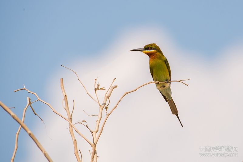 學(xué)名Merops philippinus,為中型鳥類,體長(zhǎng)約25-31cm。頭部、枕部和背部為綠色,具有一條寬闊的黑色貫眼紋,貫眼紋上下又各具一藍(lán)色窄紋,喉部栗紅色,其余下體藍(lán)綠色,腰部和尾為藍(lán)色,中央尾羽延長(zhǎng);虹膜紅色,嘴黑色、細(xì)長(zhǎng)而向下彎曲。在陽光的照射下,全身閃爍著金屬般的艷麗光澤,被譽(yù)為“中國最美麗的鳥”。主要以鱗翅目、蜂類、白蟻、蟬等各種飛行性昆蟲為食。繁殖期4-6月,營巢于河流、溪邊較陡峭的土質(zhì)巖壁上。