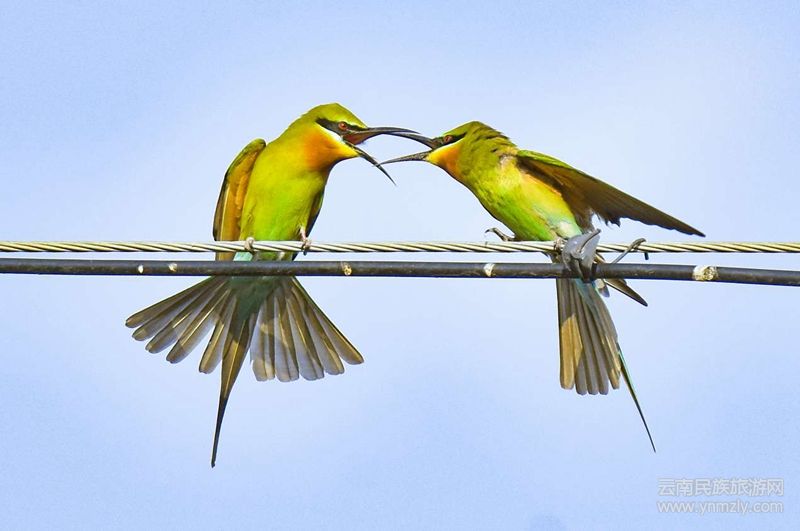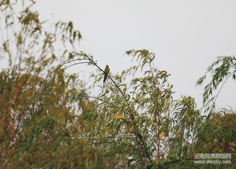 2020年4月8日下午,保山青華海國家濕地公園管理中心的工作人員在東河邊開展鳥類監(jiān)測(cè)的時(shí)候,發(fā)現(xiàn)了一群30只左右的栗喉蜂虎。它們時(shí)而停留在河邊的電線或柳樹枝頭上,時(shí)而歡快跳躍于低矮灌木叢中,時(shí)而于飛翔中捕食蜻蜓、蛾子等昆蟲。這是自2019年以來栗喉蜂虎第2次來到青華海,而且這次的種群數(shù)量比去年多了很多。